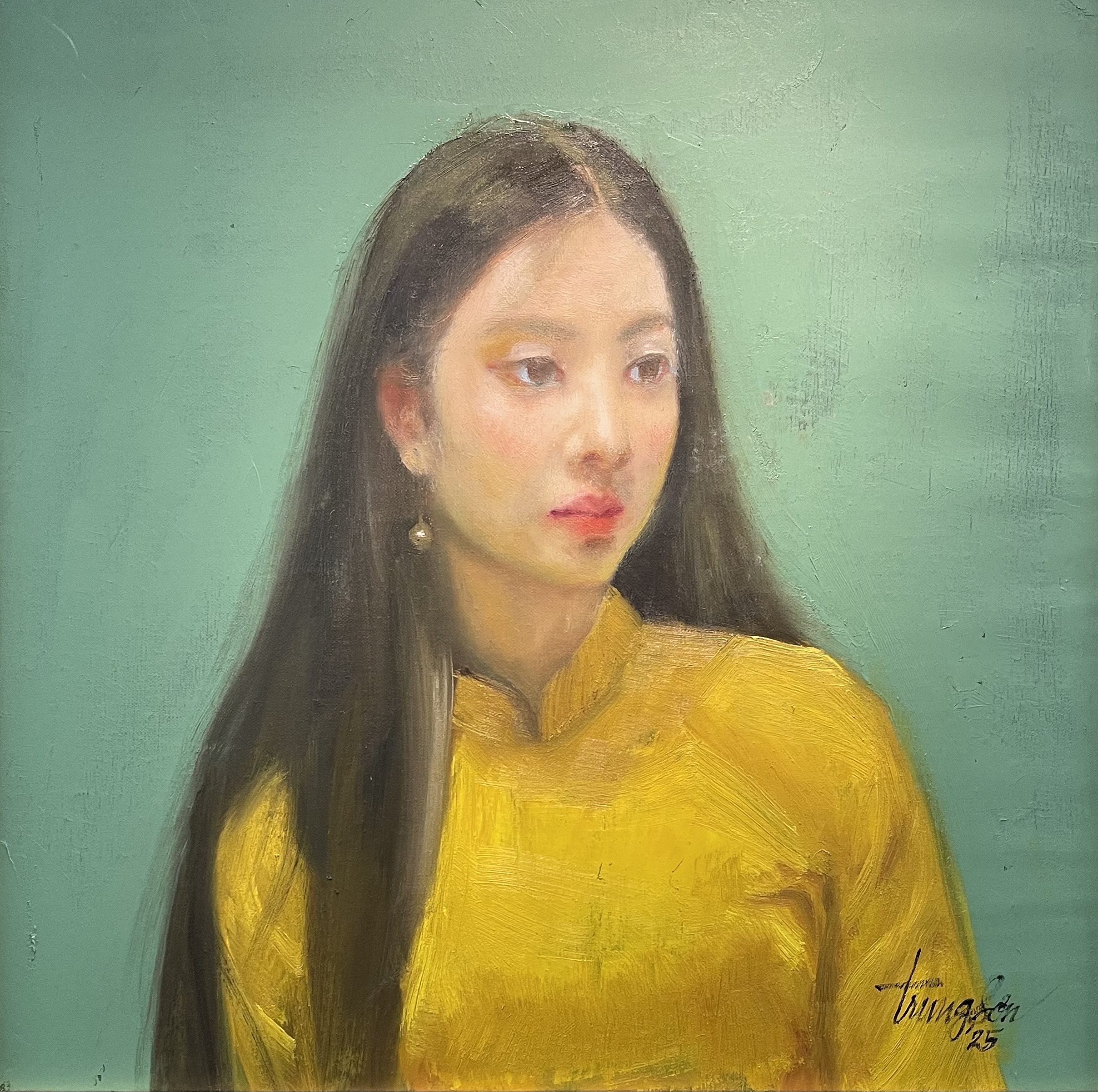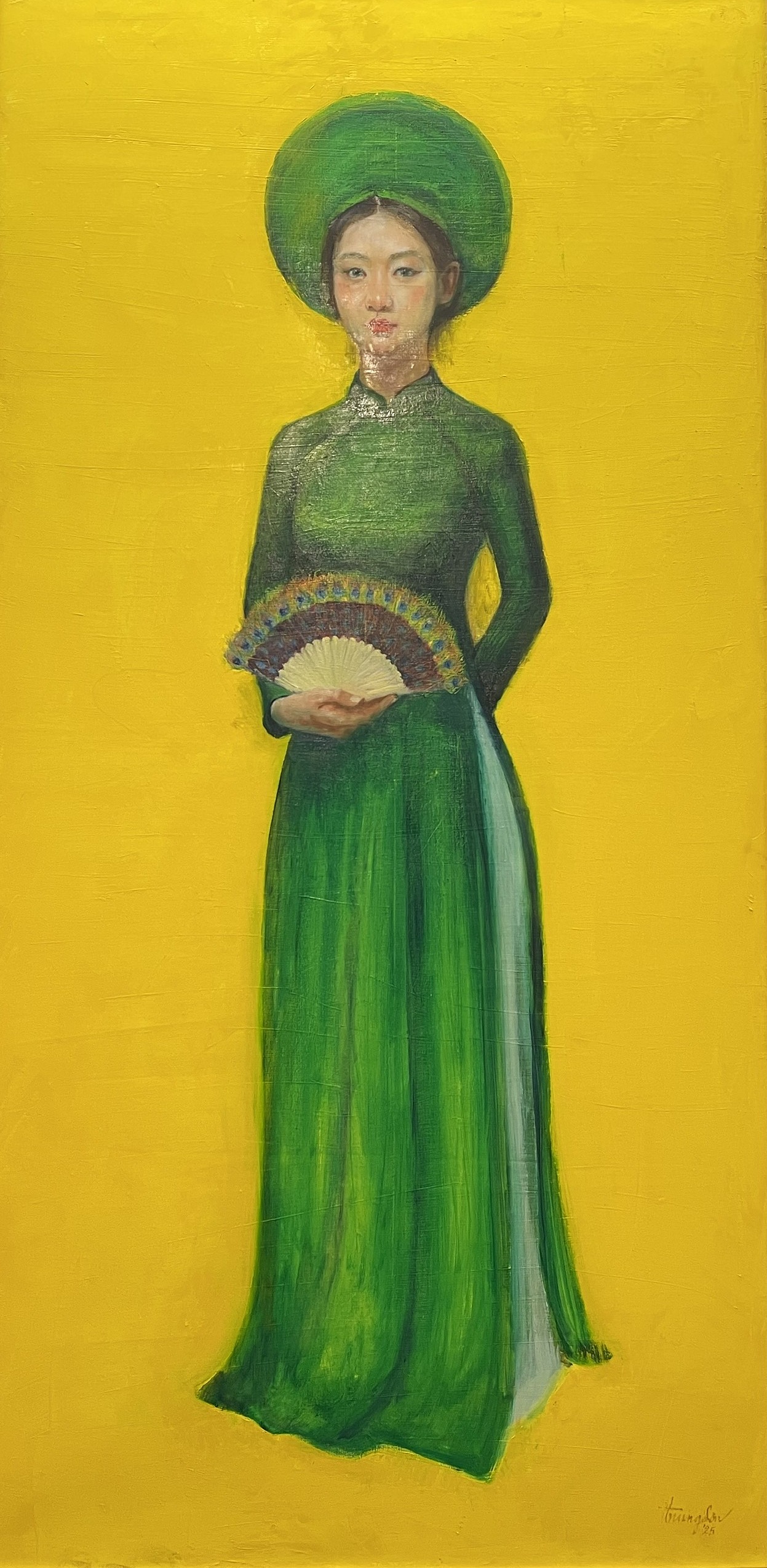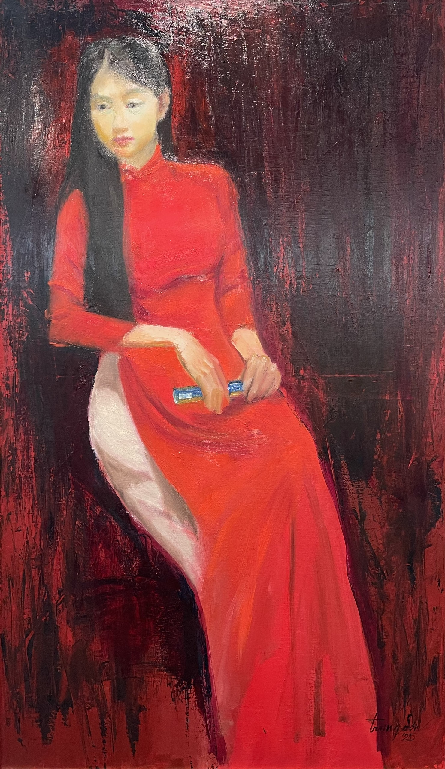 In his portraits, such as "Tuoi mo 1" (Dream Age 1), Trung Son depicts girls in traditional white ao dai, using vibrant monochromatic backgrounds to highlight the subject. He does not focus on precisely depicting the model's facial features but rather relies on his own feelings, retaining only the most characteristic details. In some works, the painter initially drew chairs for the girls, then gradually removed them, portraying figures in a sitting posture but without support. This compositional choice creates a space for the audience to "step into" and form their own interpretations.