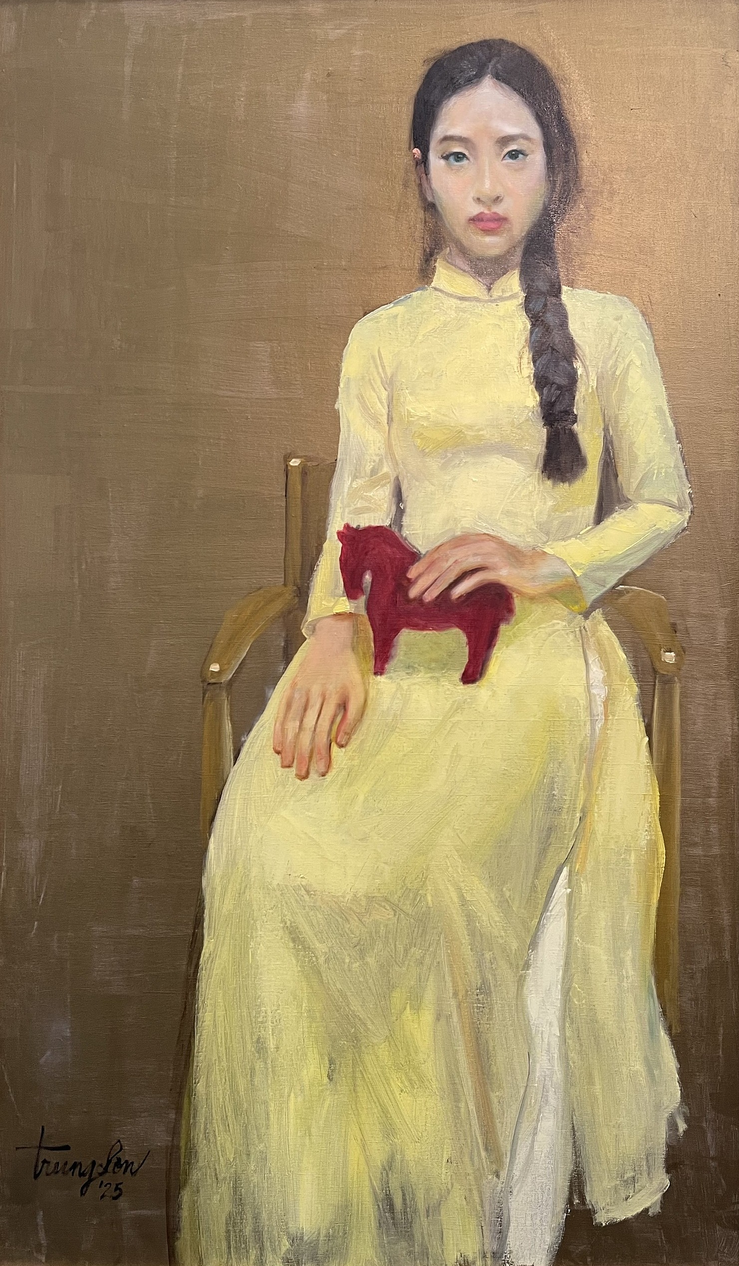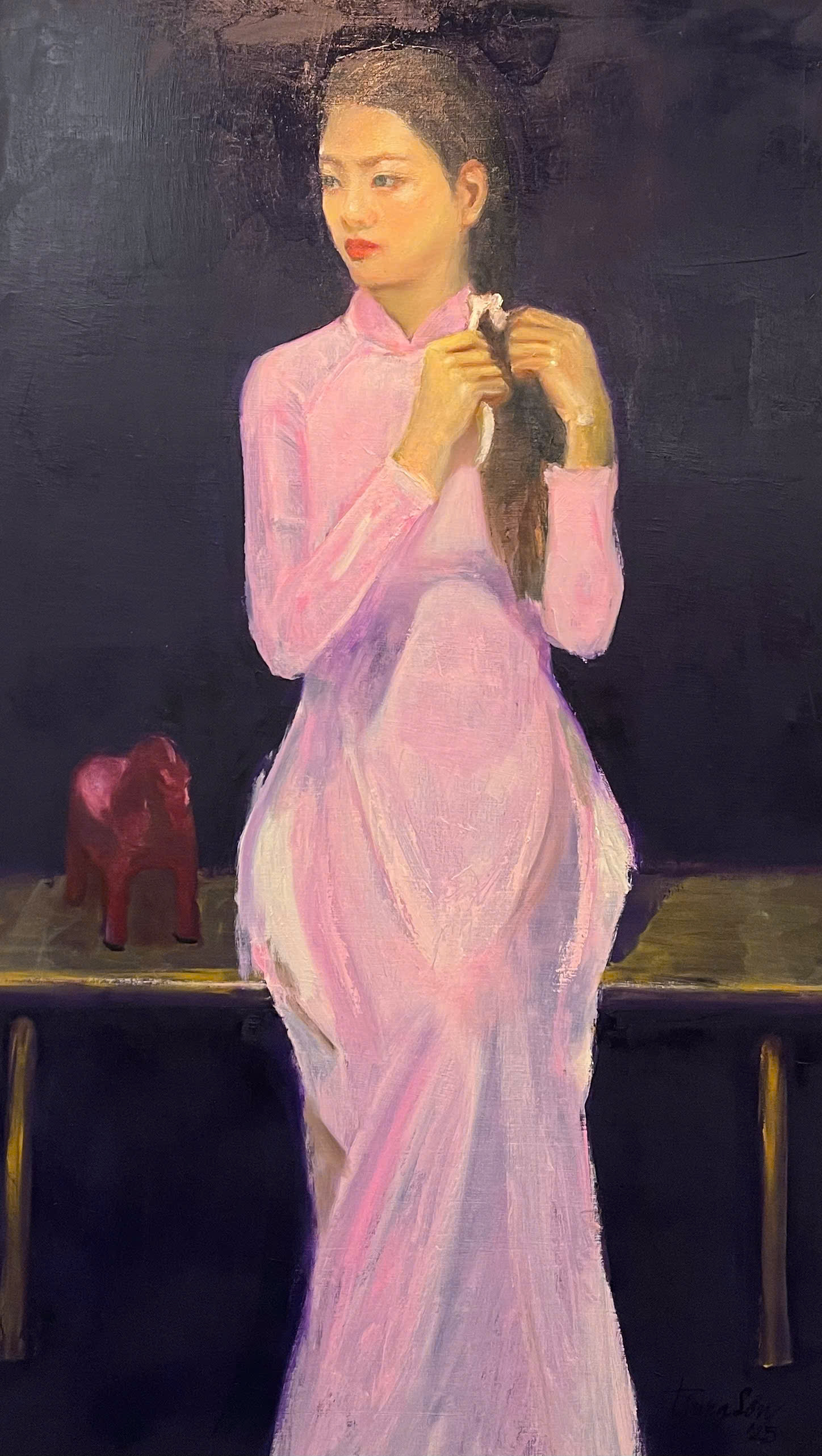 A recurring image in Trung Son's paintings is a small red or pink horse, often held by the young woman or placed beside her. The painter states that the horse symbolizes dynamism and a desire to explore the world, mirroring the soul of an adolescent girl and revealing the silent inner movements of the character.