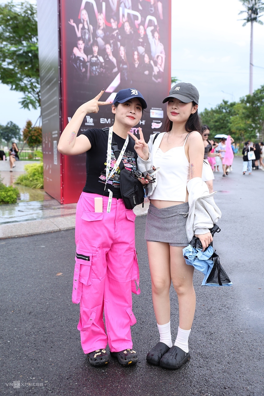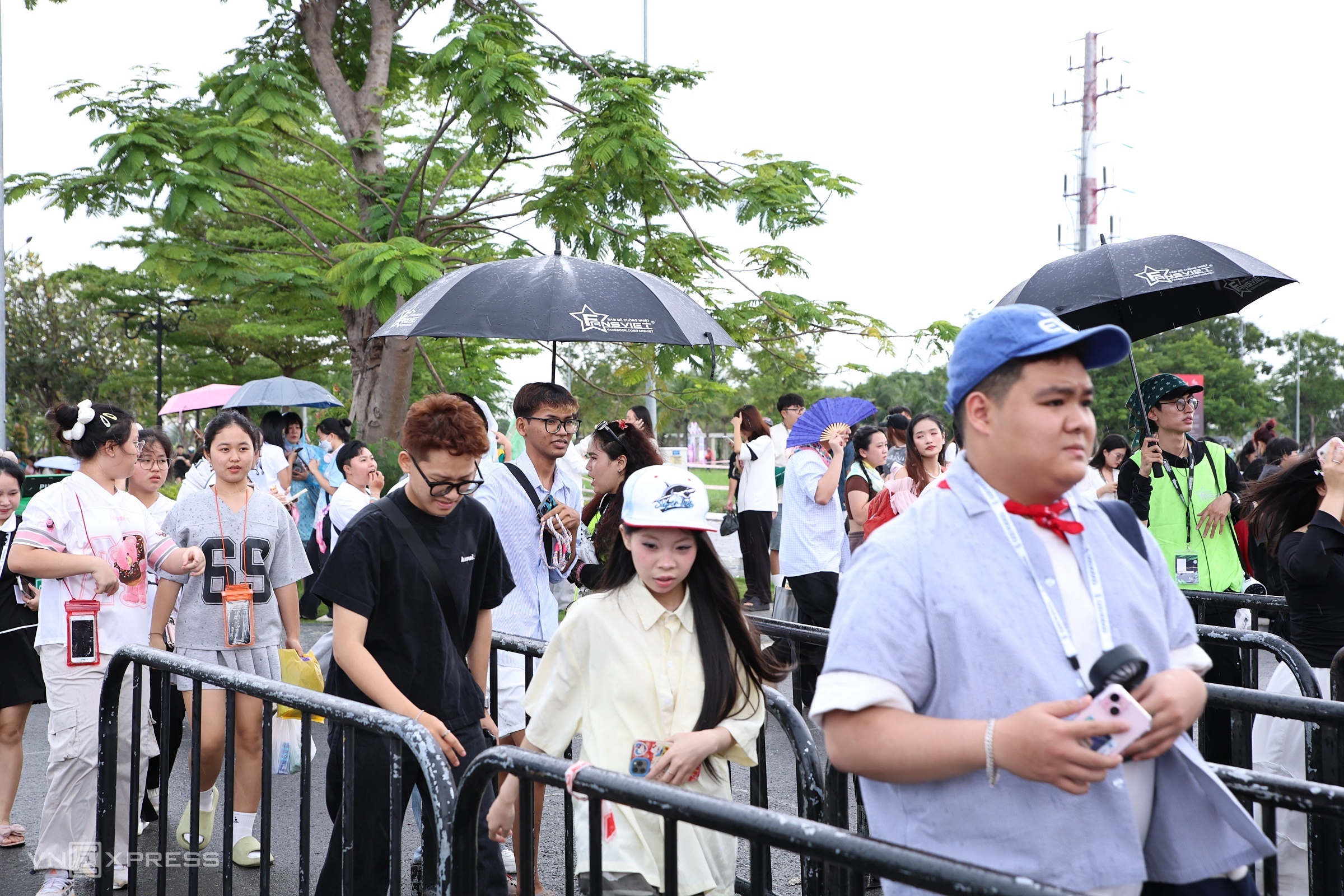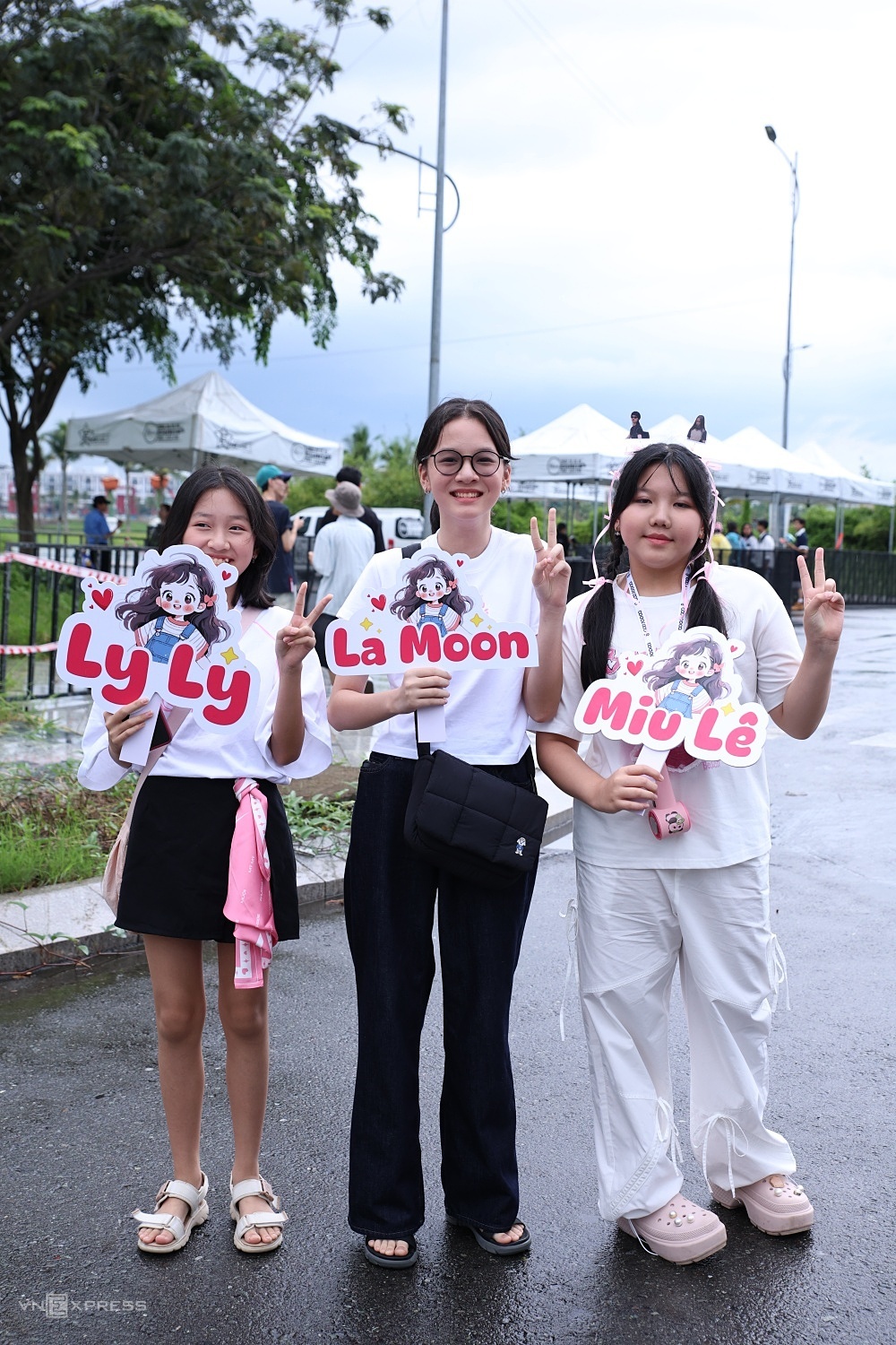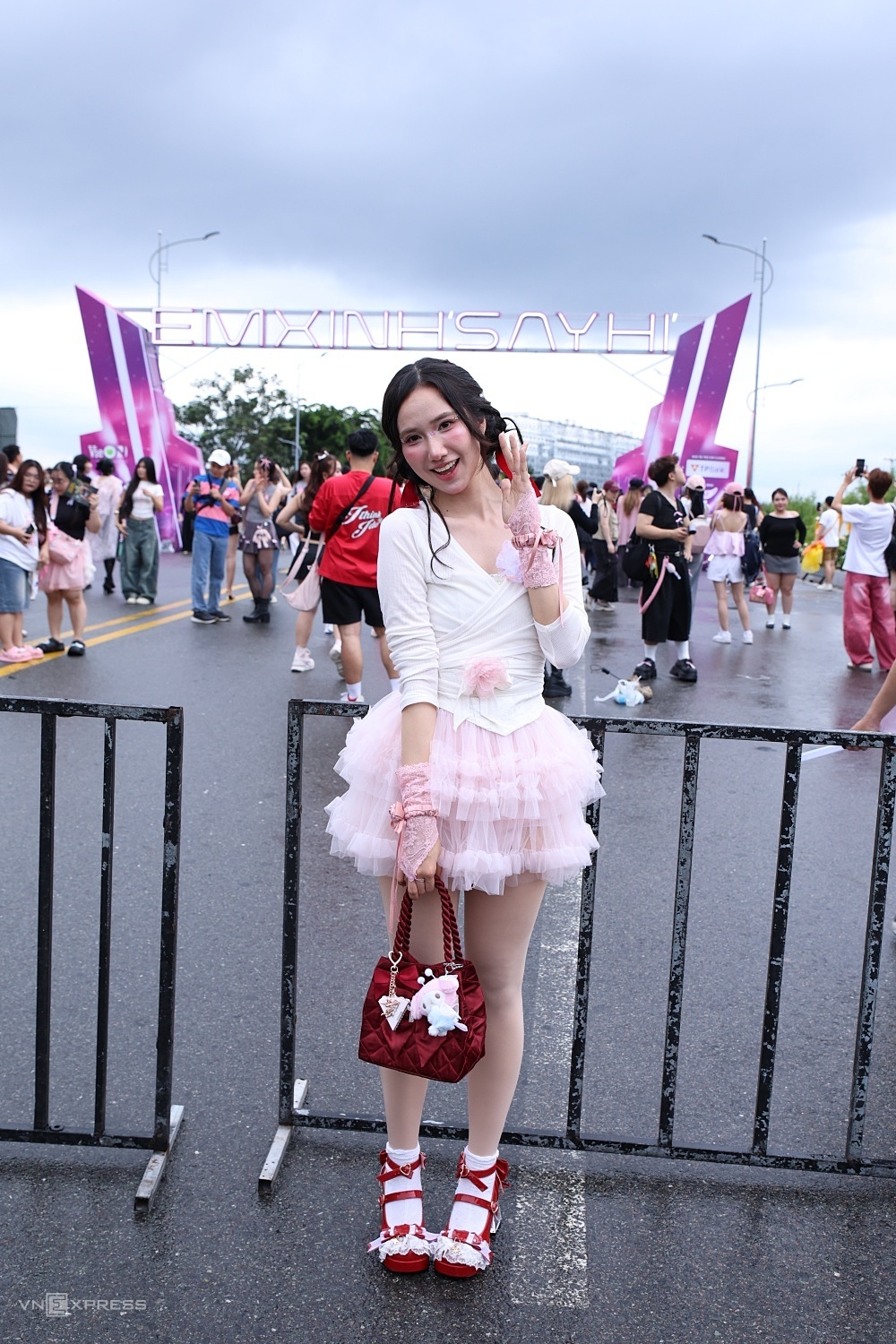 Most of the attendees were Gen Z. Despite the unfavorable weather, fans of the "em xinh" (beautiful girls) maintained their youthful styles. Many teenage girls sported braids, ribbons, and cartoon-themed accessories.