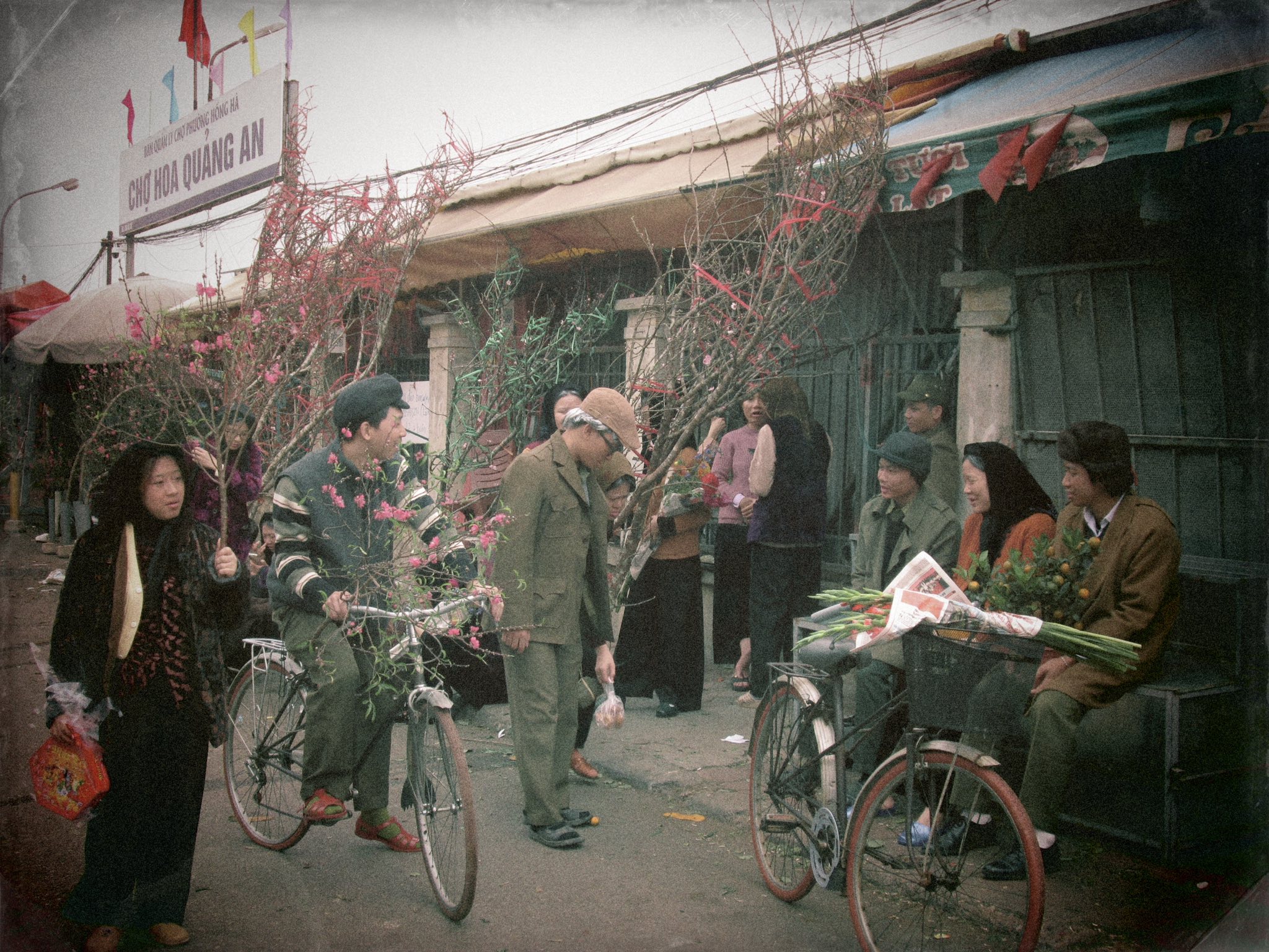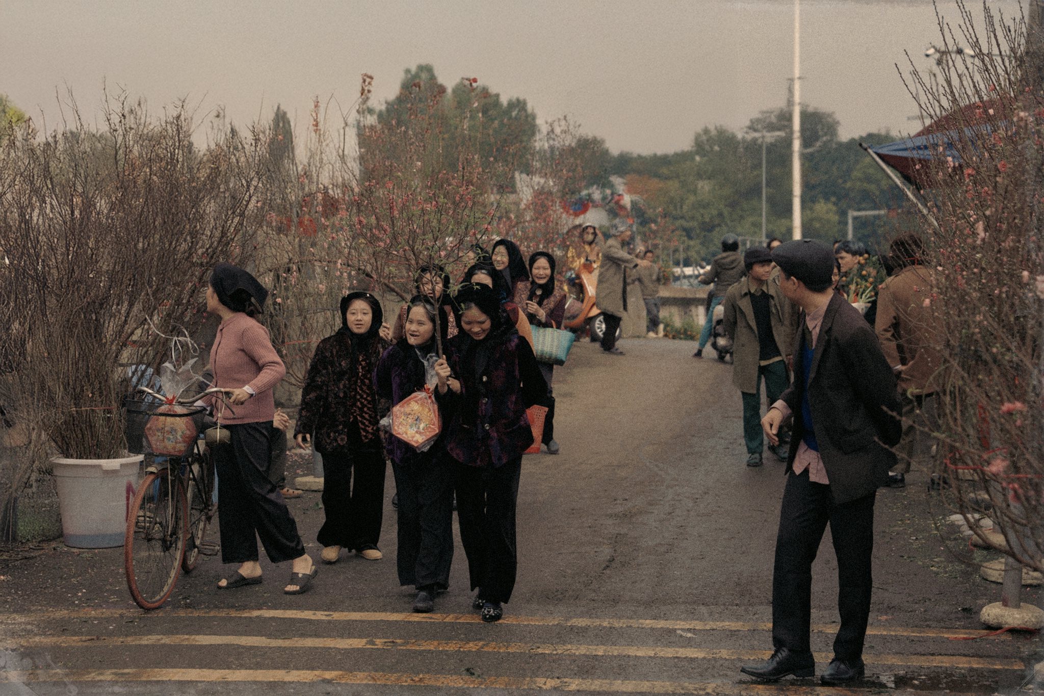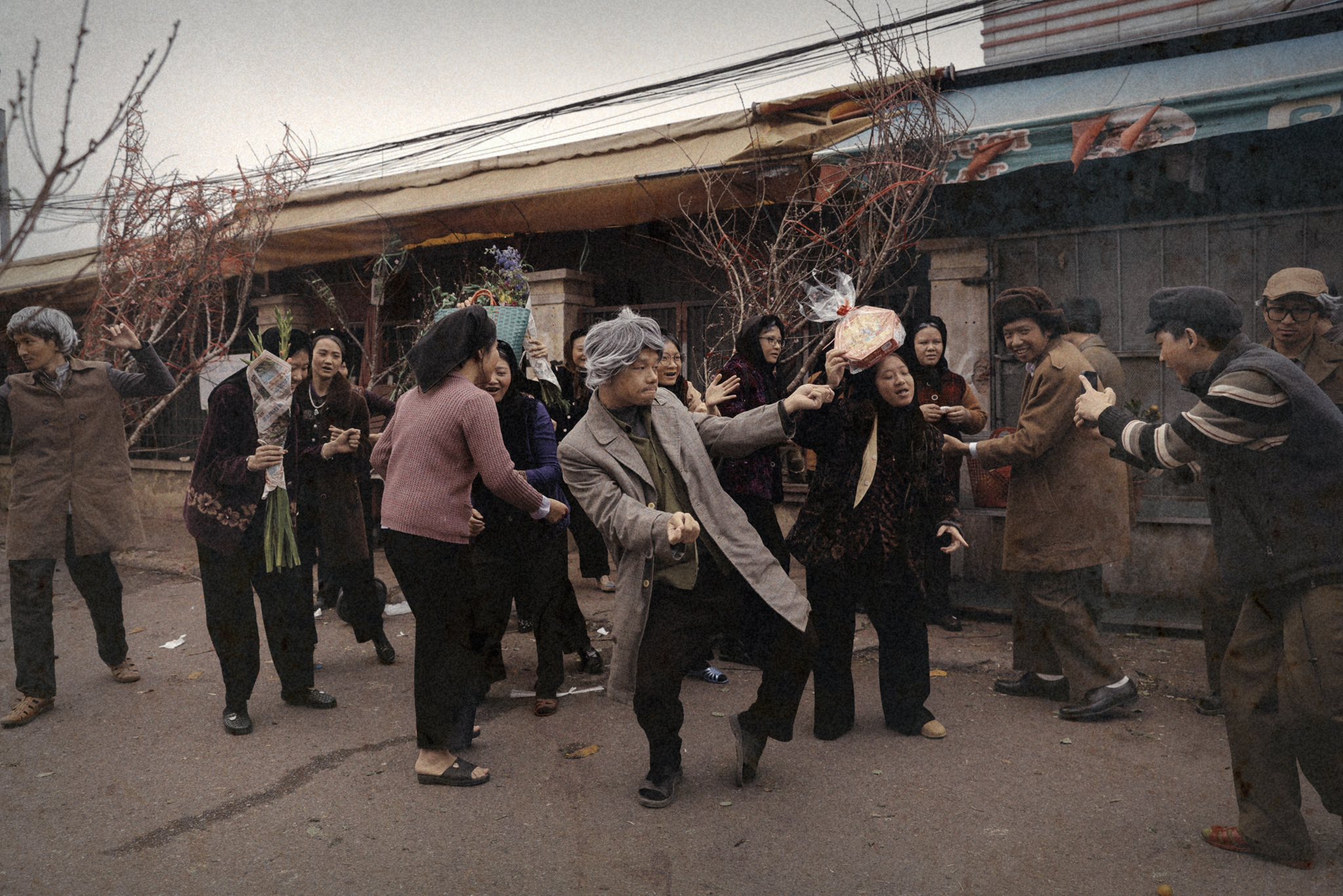 The young people embody elderly individuals visiting the flower market for Tet. Some buy peach branches and boxes of candied fruit, while others carry home bouquets of gladioli. |