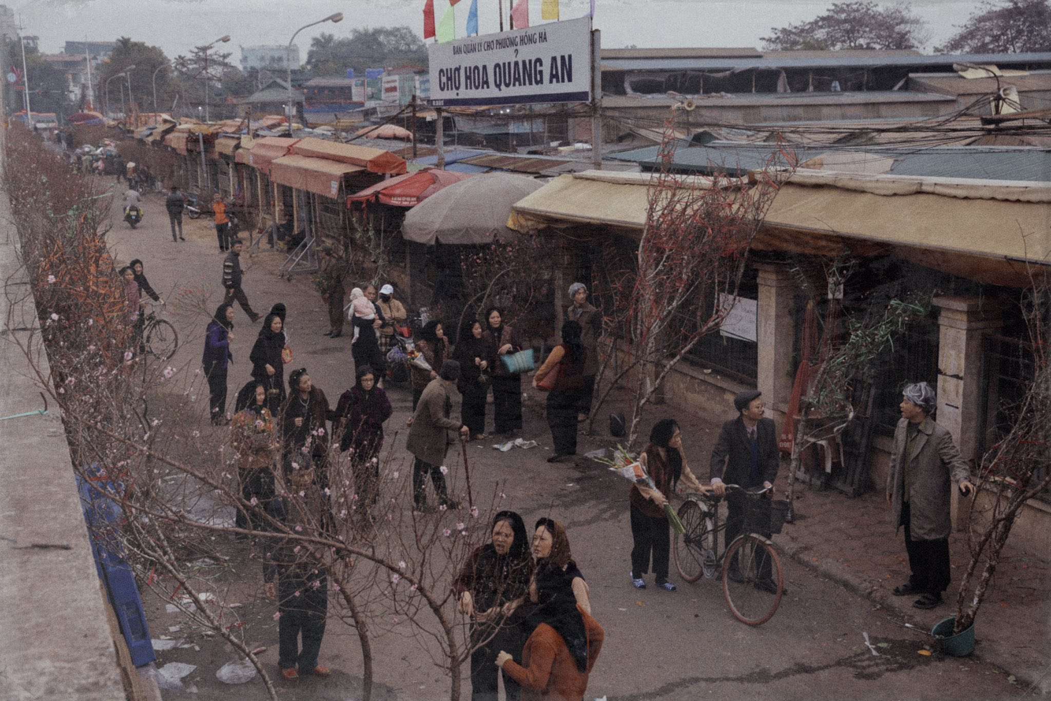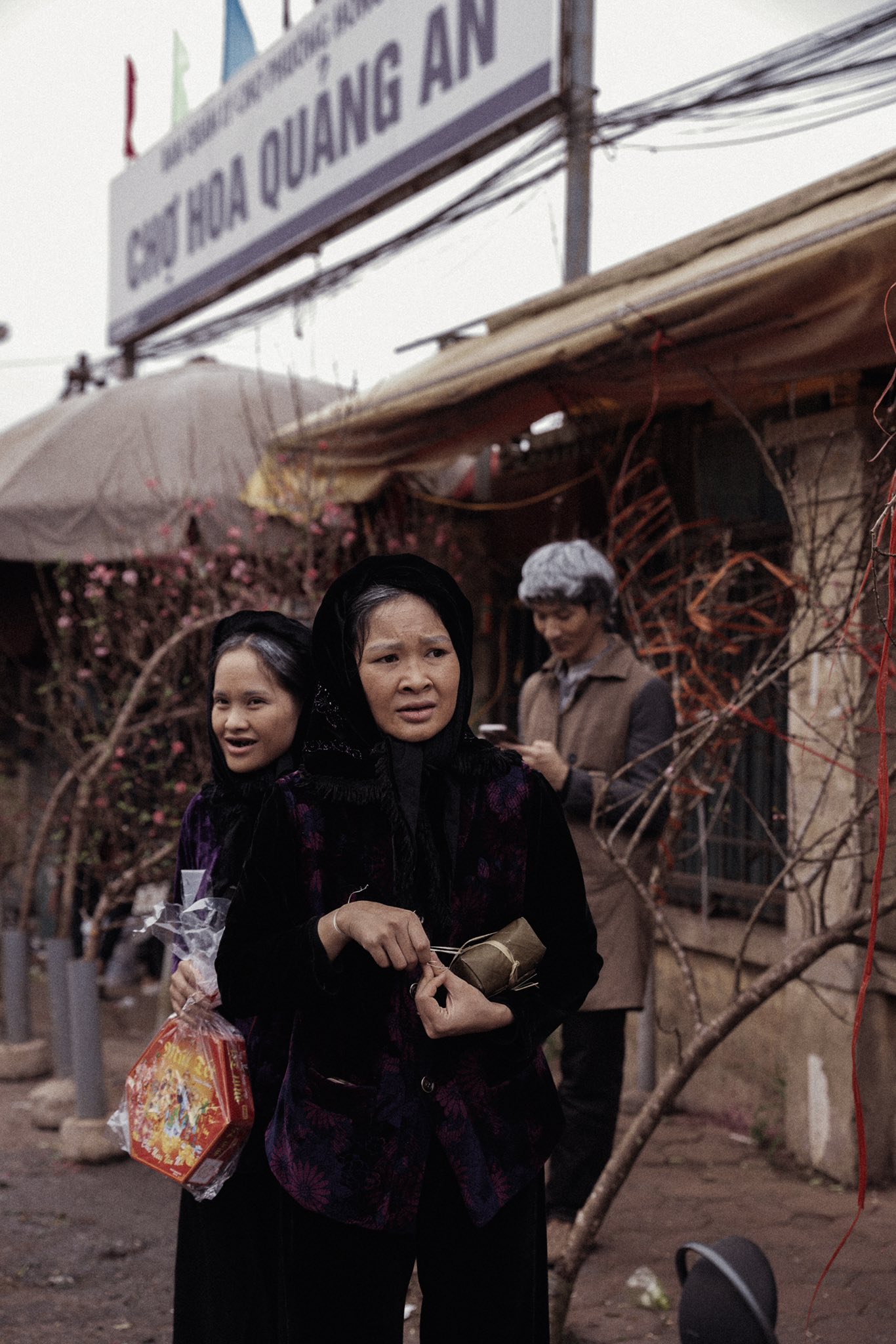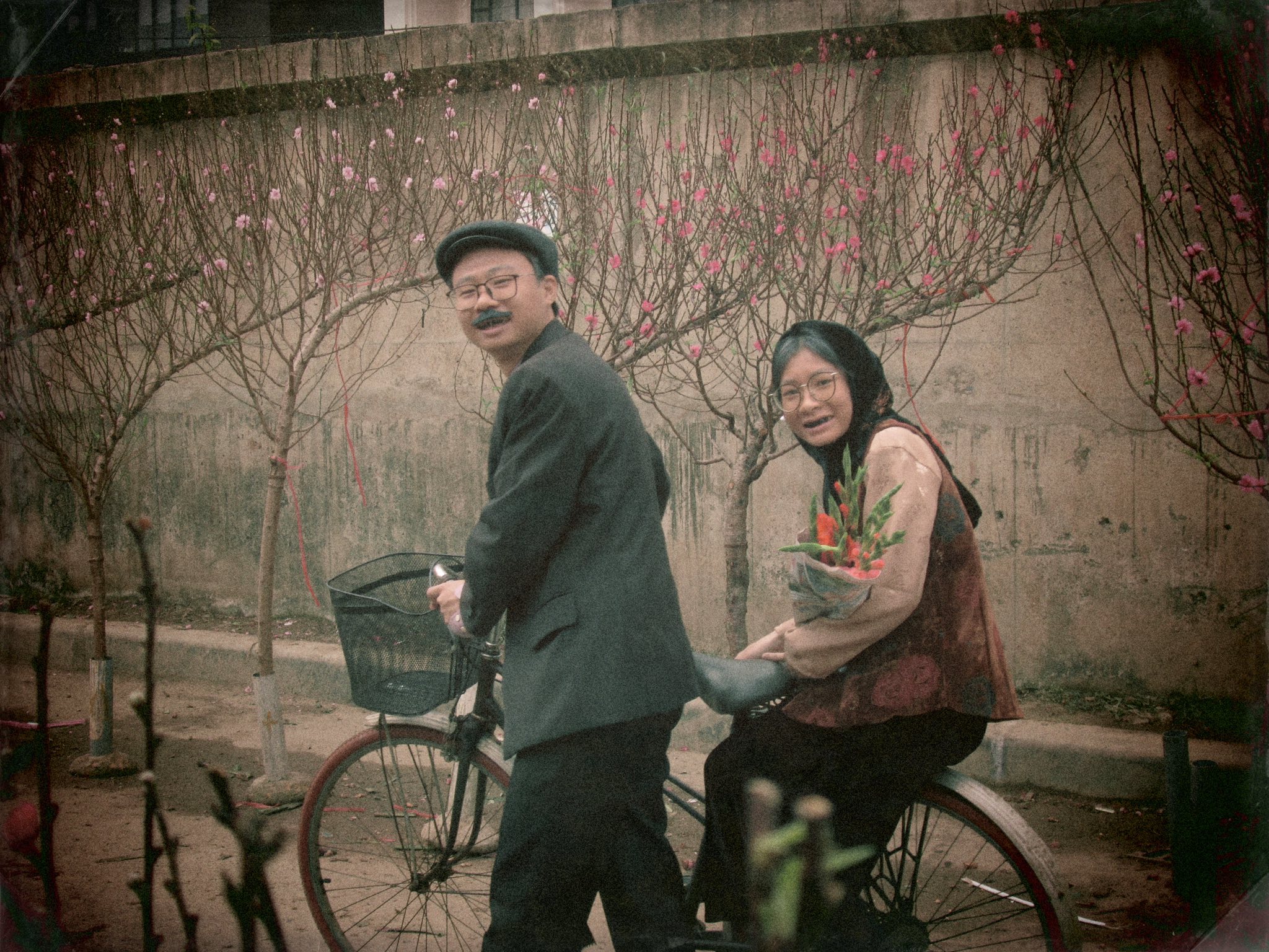 The young people embody elderly individuals visiting the flower market for Tet. Some buy peach branches and boxes of candied fruit, while others carry home bouquets of gladioli. |
