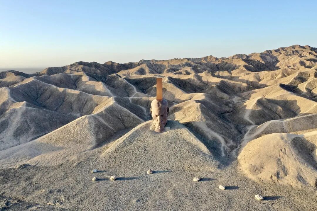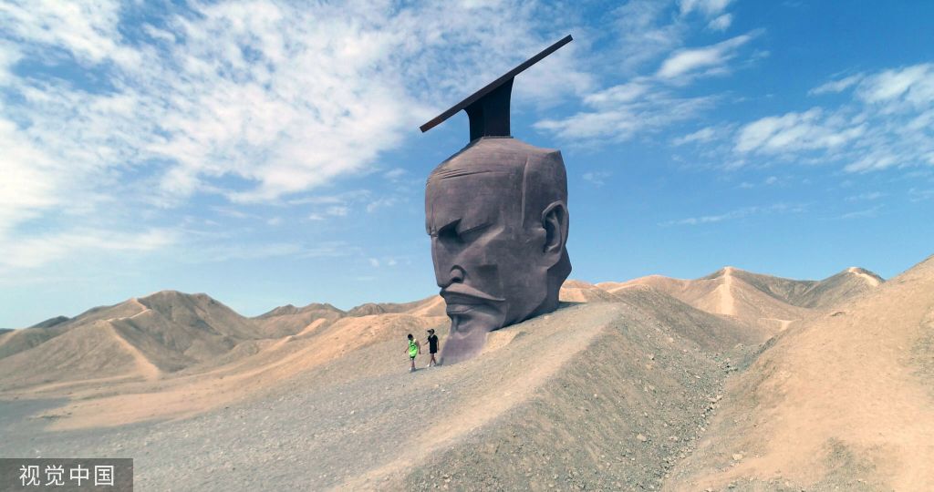 The statue, completed in 2020, stands 13 m tall and is crafted from ancient red sandstone. Its body is concealed beneath the desert, with only the head visible. This piece is part of the "Wilderness Art Plan", initiated by Professor Dong Shubing of Tsinghua University. The artist, Zhang Wanxing, a graduate of Hebei University of Technology, works at Professor Dong Shubing's sculpture studio.