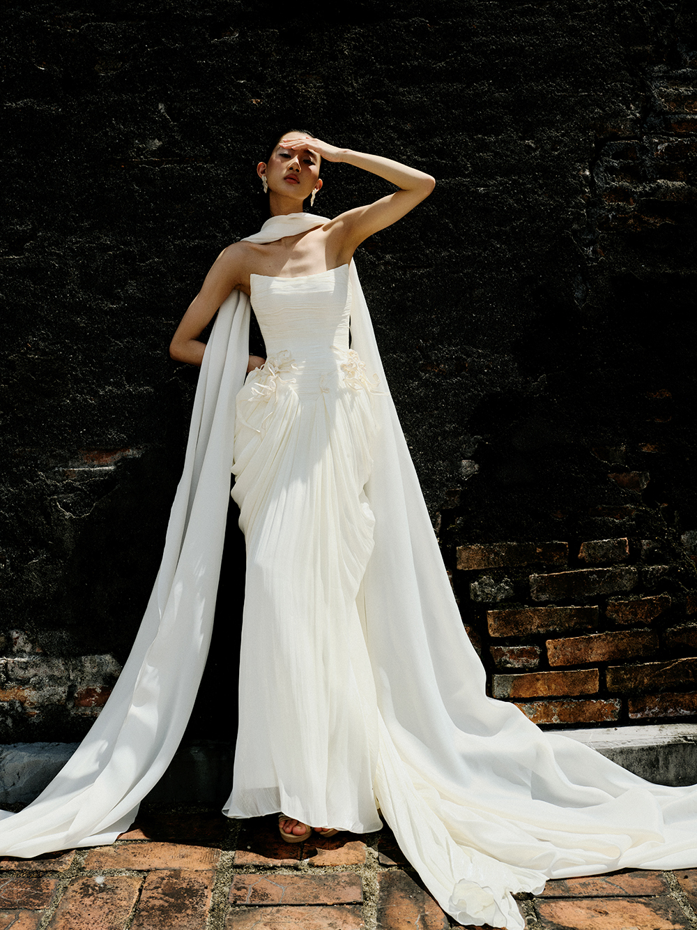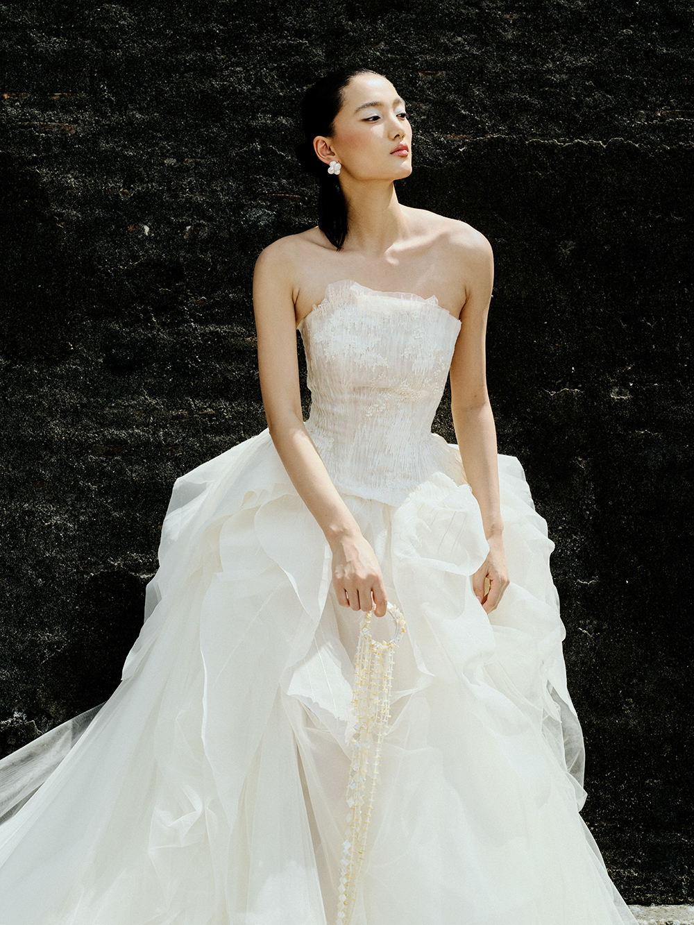The wedding dresses utilize high-quality silk and voile, with balloon-styled hems adding a youthful, flowing touch.