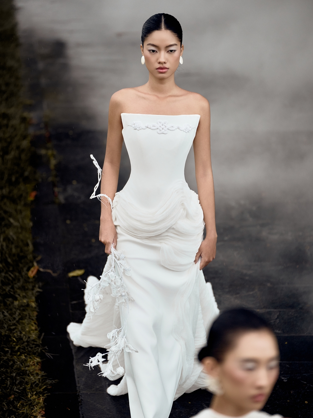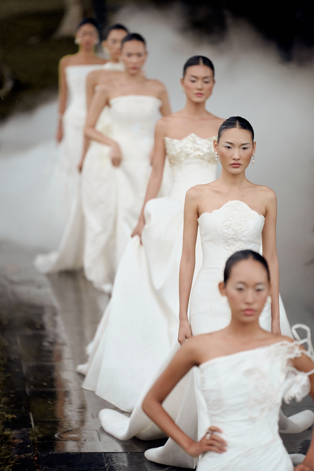 Most designs focus on strapless dresses, corset bodices, and flared skirts. The remaining designs feature mermaid and trumpet silhouettes. In addition to traditional long gowns, the show also included short, see-through wedding dresses.