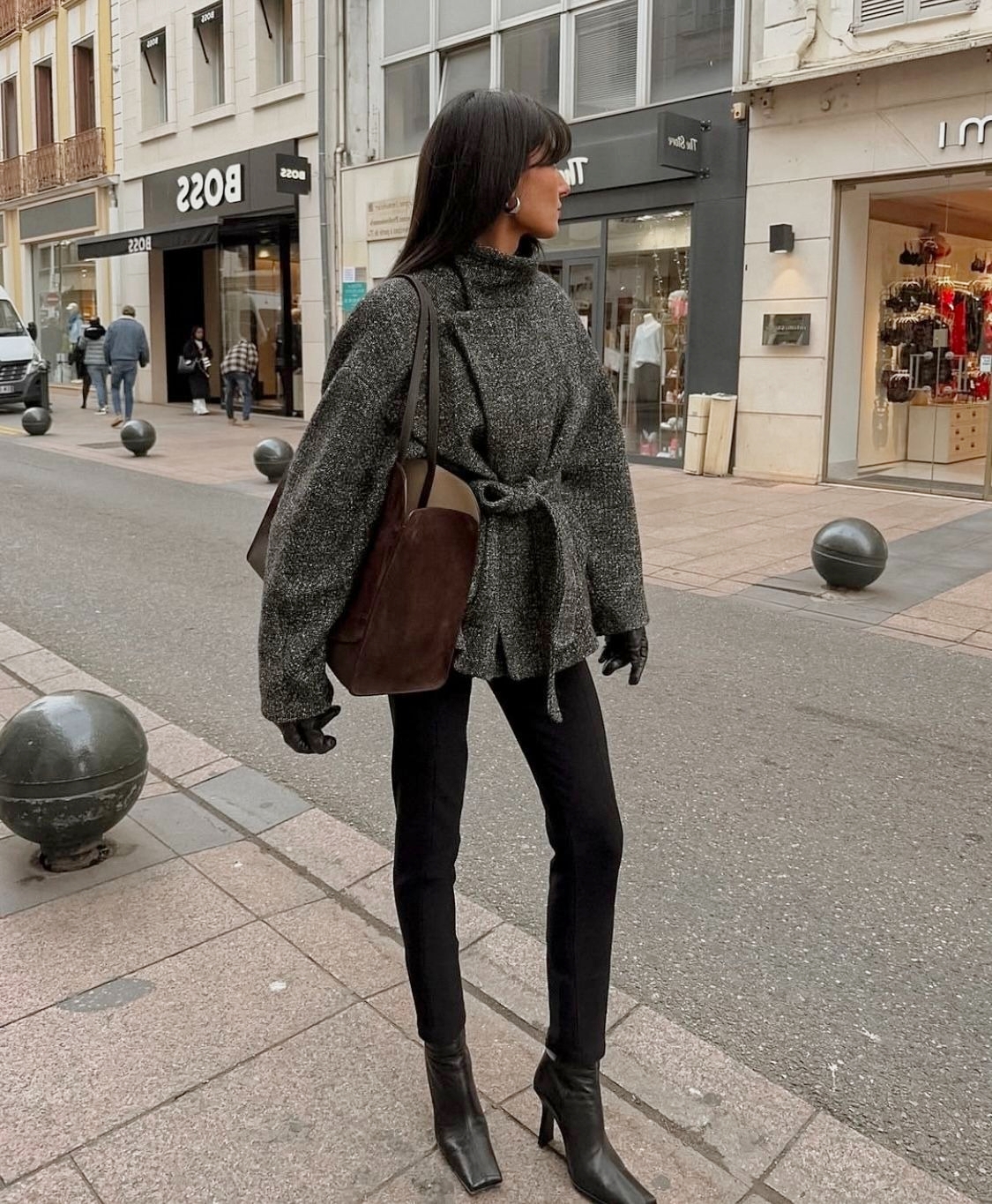 A fashionista paired them with boots and a short jacket, creating a neat and eye-catching office outfit. |