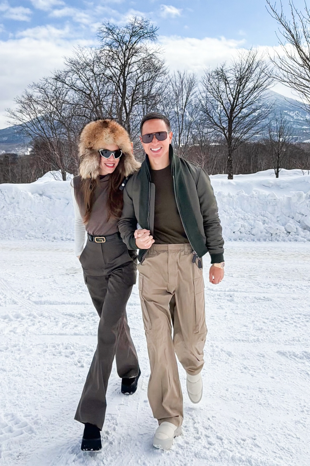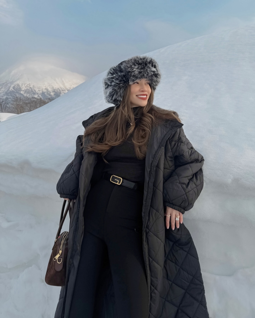 She wore an autumn-winter style, featuring monochrome attire, a leather belt, and a fur hat.