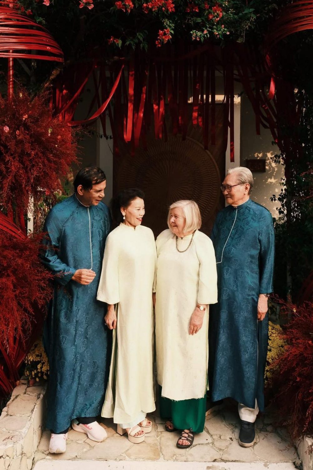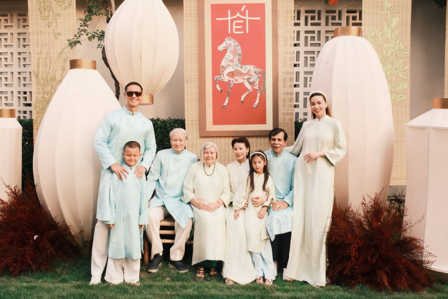 Prior to their trip, the family celebrated Tet at their villa in Thao Dien, TP HCM. Kim Ly's parents, who are the second and third from the left in the photo, arrived from Sweden in 11/2025 for their daughter-in-law's birthday, and the extended family then welcomed the New Year together.