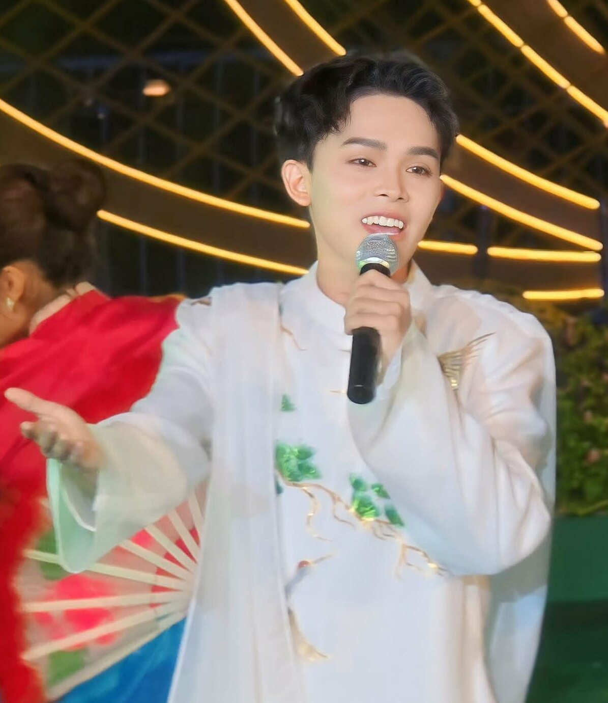 Ho Van Cuong surprised the audience with his smooth ca co singing alongside the veteran artist. He shared that Huu Quoc provided detailed guidance on vocal techniques for clear pronunciation, and he practiced for two days before the performance. The singer was previously taught ca co by his adoptive mother, singer Phi Nhung.