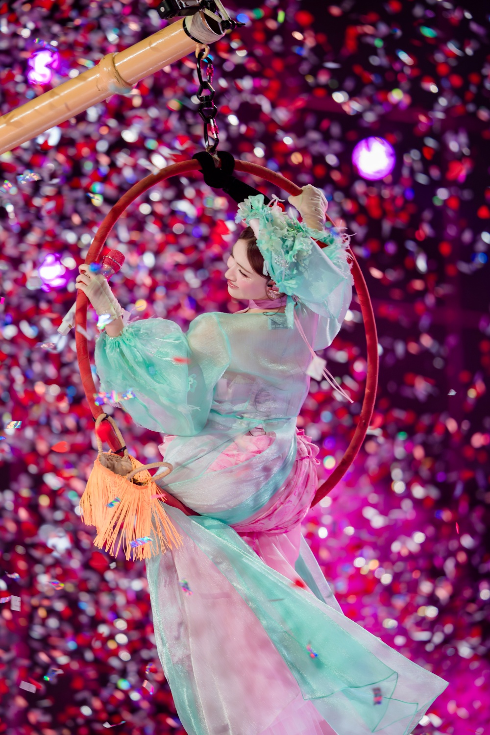 Hoa Minzy on the swing ring during the "Thi Mau" performance. Photo: Organizers provided.