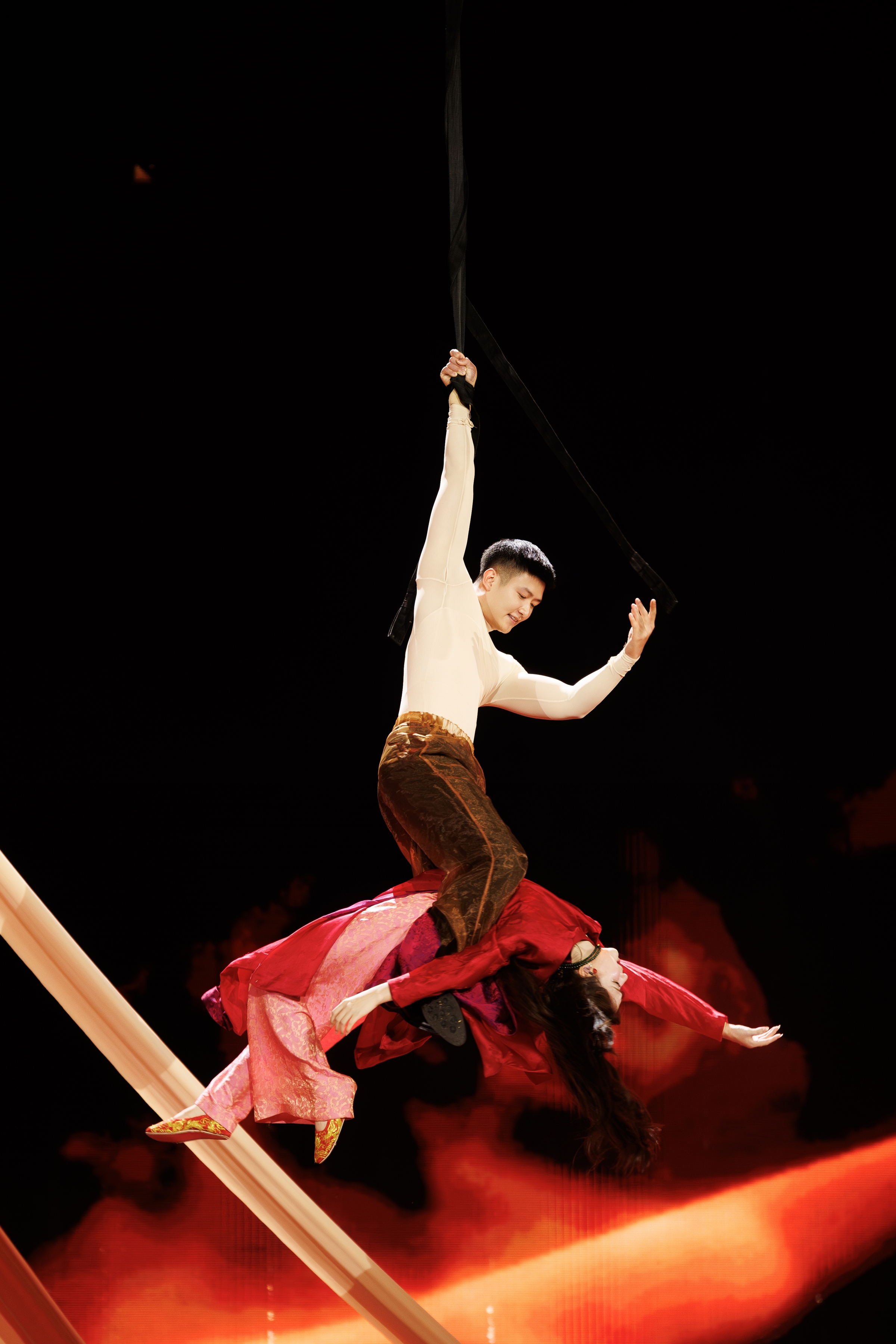 During the performance, Hoa Minzy wrapped ropes around her wrists, soaring through the air in multiple spins. She then hooked her legs around her partner and continued to rotate. At the climax, she released both hands, allowing Ngoc Hieu to hold her in a balanced position using only his feet, without safety equipment. Some guests who witnessed the live show admitted they "skipped a beat" due to Hoa Minzy's daring performance. The concert also featured other aerial acts, including Hoa Minzy hanging in the air during the opening act, "Bat Tinh Yeu Len". While singing "Thi Mau", she recreated the traditional folk game of swinging, a cultural feature of festivals in the Northern region. The singer sat on a ring, held only by a single fabric strap in her hand, singing and interacting with fans as the ring swung around the stage multiple times.