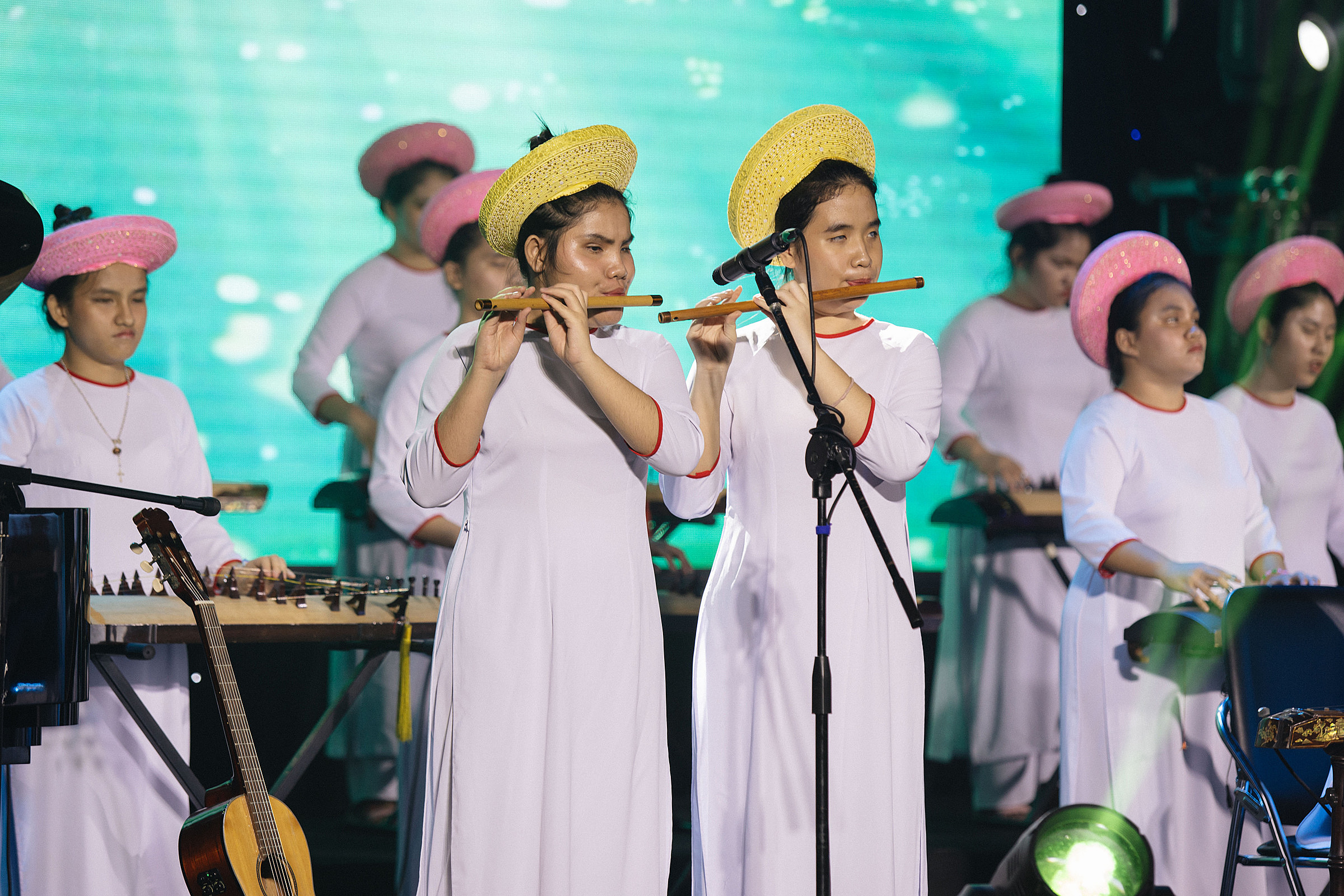 A moving performance was delivered by visually impaired children from the Nhu Nghia Brotherhood Shelter. As they played traditional instruments for the song "Uoc Vong Cho Tuoi Tho" (Aspirations for Childhood), many in the audience were moved to tears. Some parents said this performance resonated with them the most, highlighting the children's resilience in overcoming adversity.