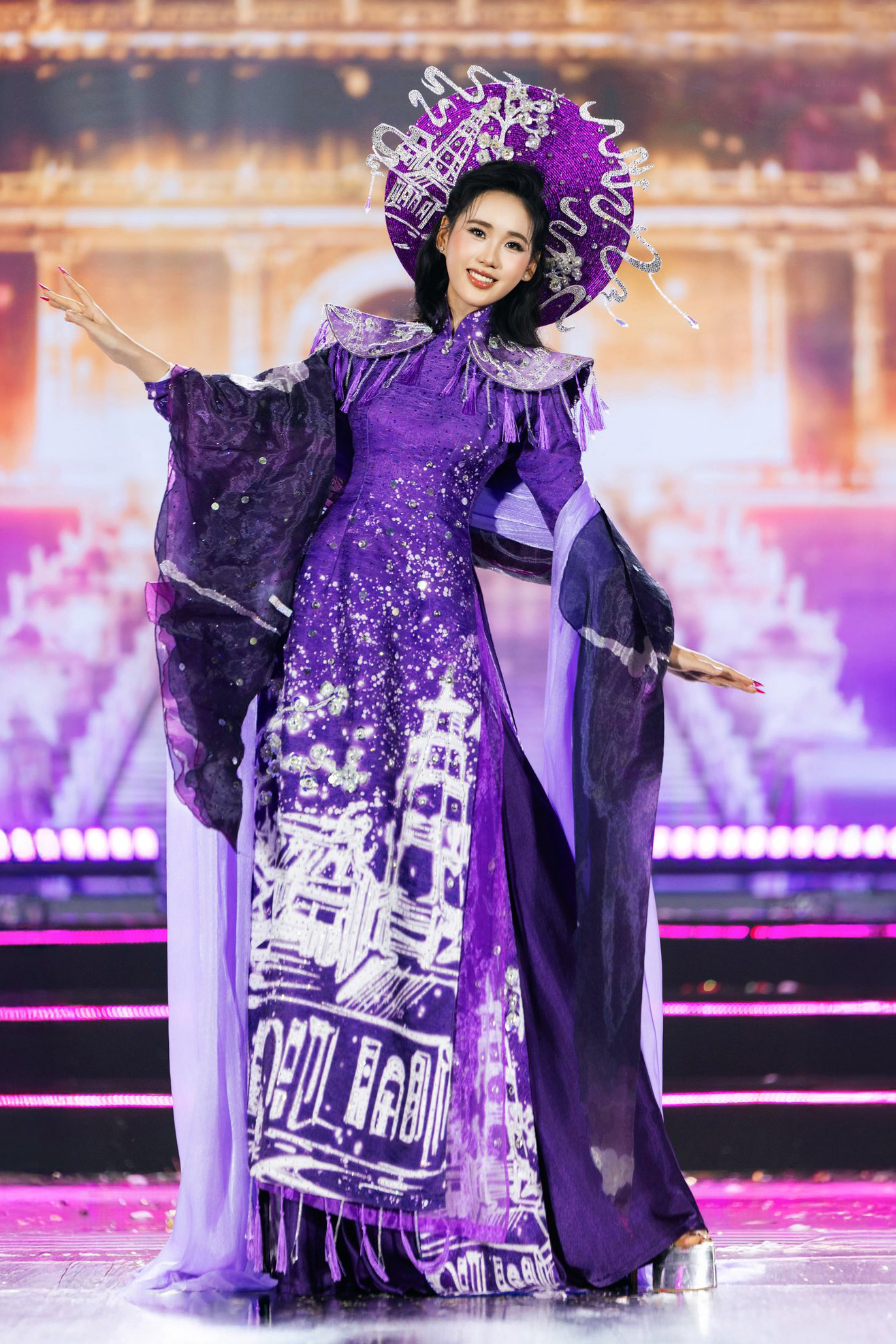 The 21-year-old beauty captivated many with her gentle presence and dedication to showcasing her hometown. During the competition, she made efforts to introduce the culture, cuisine, and landscapes of Hue, particularly in the "tourism beauty" segment. She also elegantly presented a Hue purple ao dai in the semi-final.