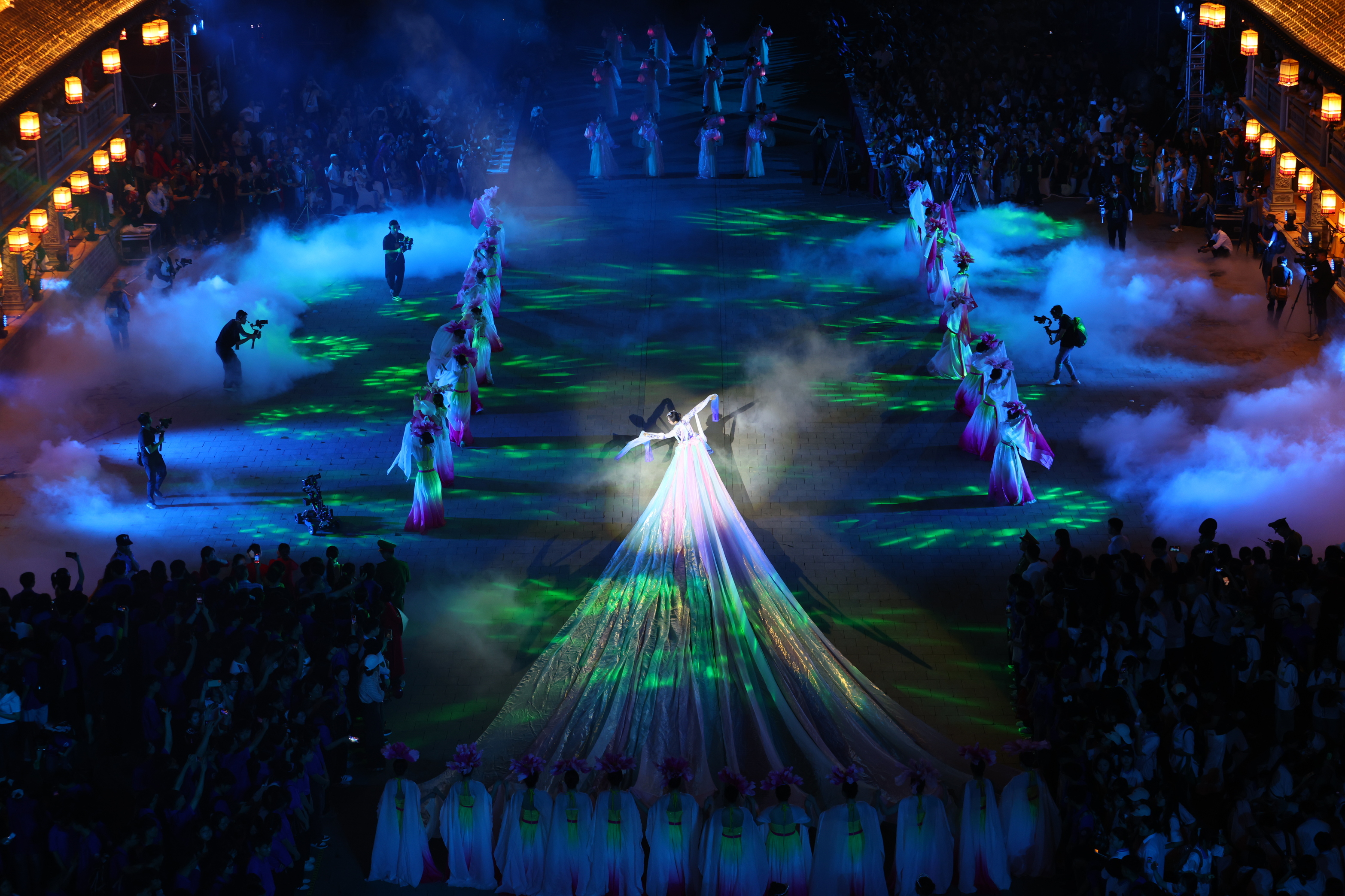Over 90 minutes, more than 2,500 artists, actors, and performers transported the audience back to the origins of national history. The program unfolded seamlessly through four chapters: Van Co Anh Linh, Dai Co Viet Khai Quoc, Huyen Thien Co Dan, and Hoi Yen Hoa Tien.