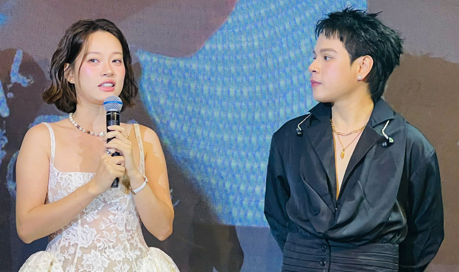 Jaykii's wife - Mai Anh (left) - at her husband's product launch. Photo: Hoang Dung |