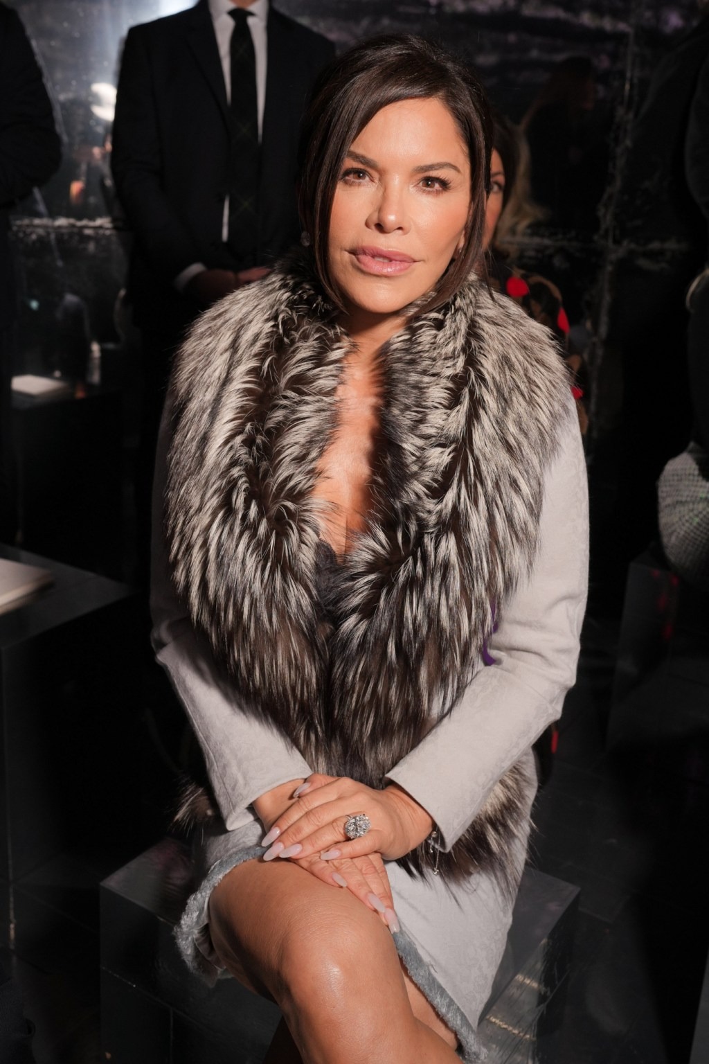 Lauren Sanchez chose an oversized fur-trimmed coat in the front row of the Dior show. Photo: WWD |