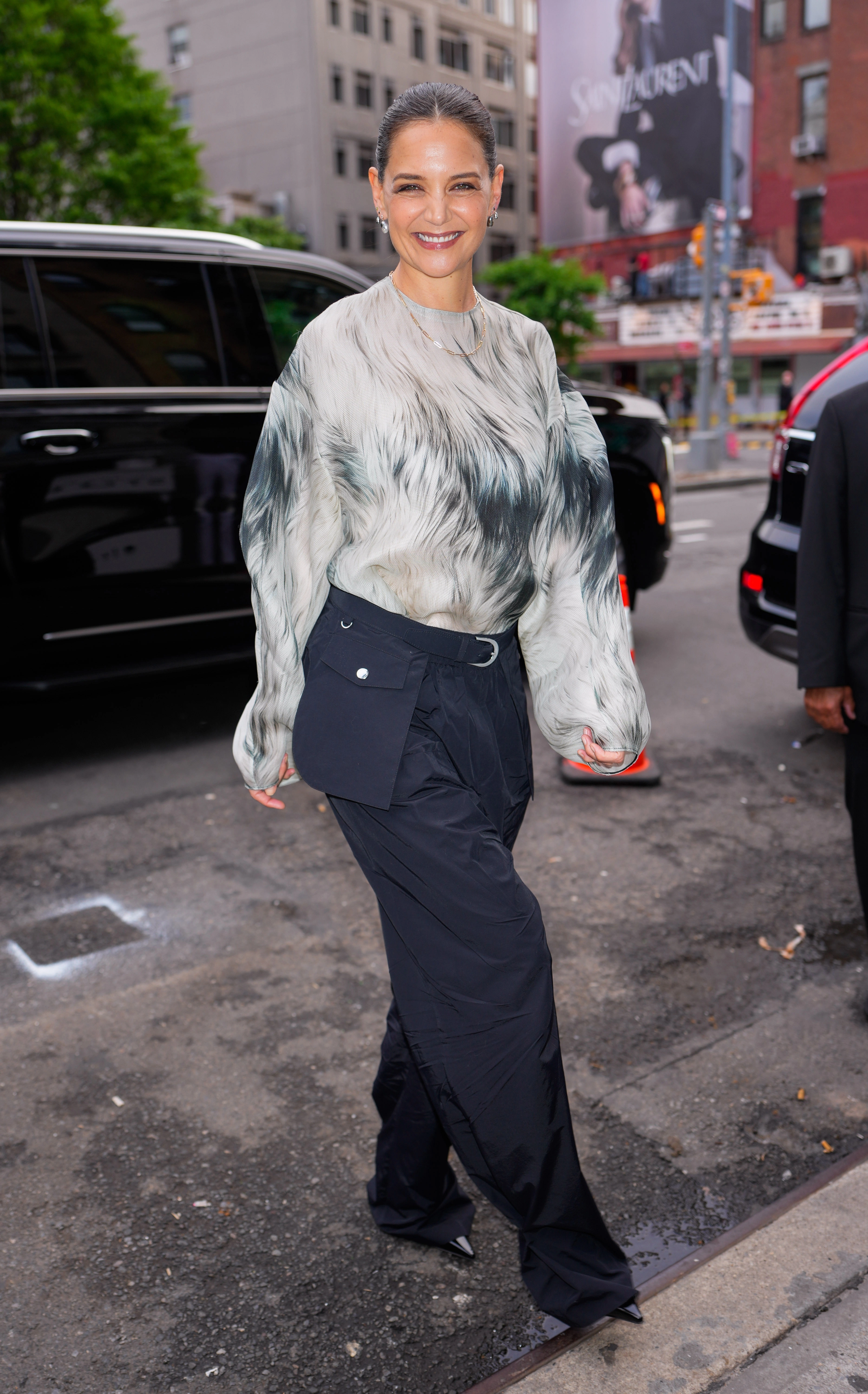 For an appearance that was both elegant and approachable, she chose cargo pants matching a trench coat, wearing a deep-cut black bodysuit underneath. Katie completed the look with high-heeled sandals and a brown bag. *GC Images* |