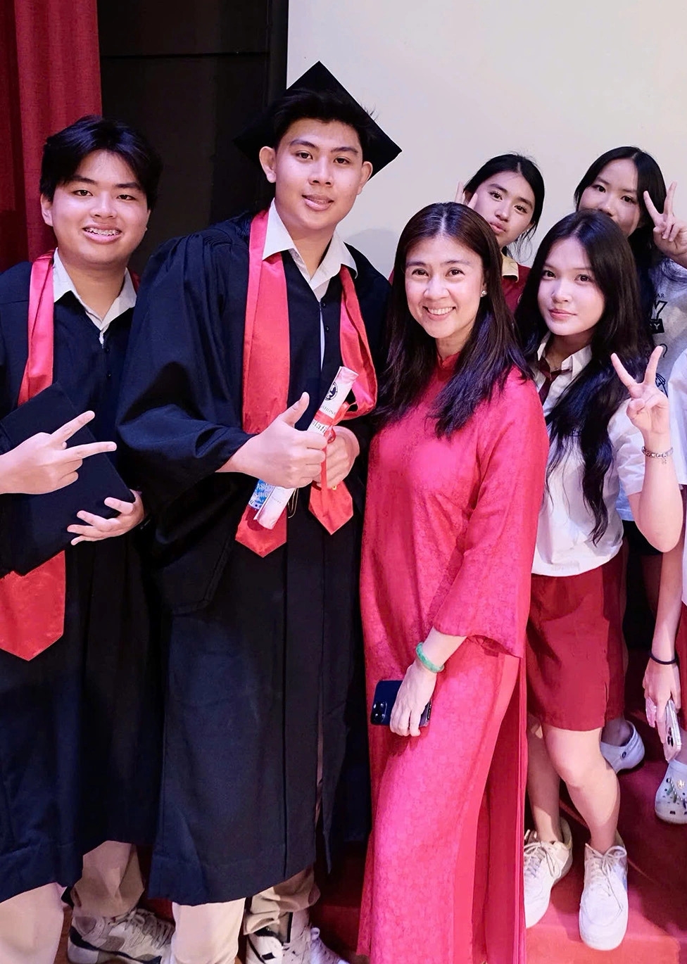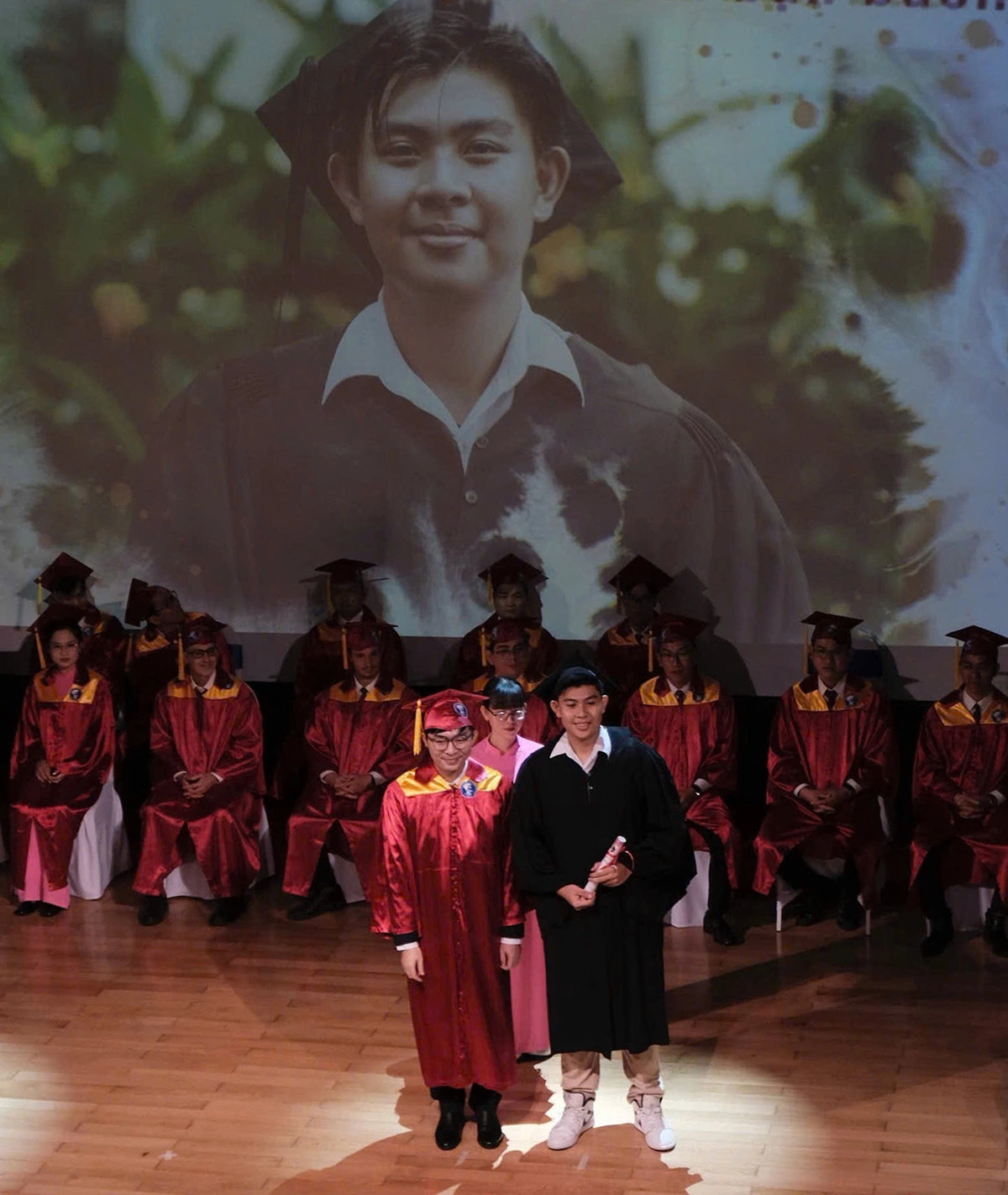 Phuoc Quang (right) at his high school graduation on 23/8 in Ho Chi Minh City. Actress Kim Thu said she was moved when her son expressed his gratitude to his parents.