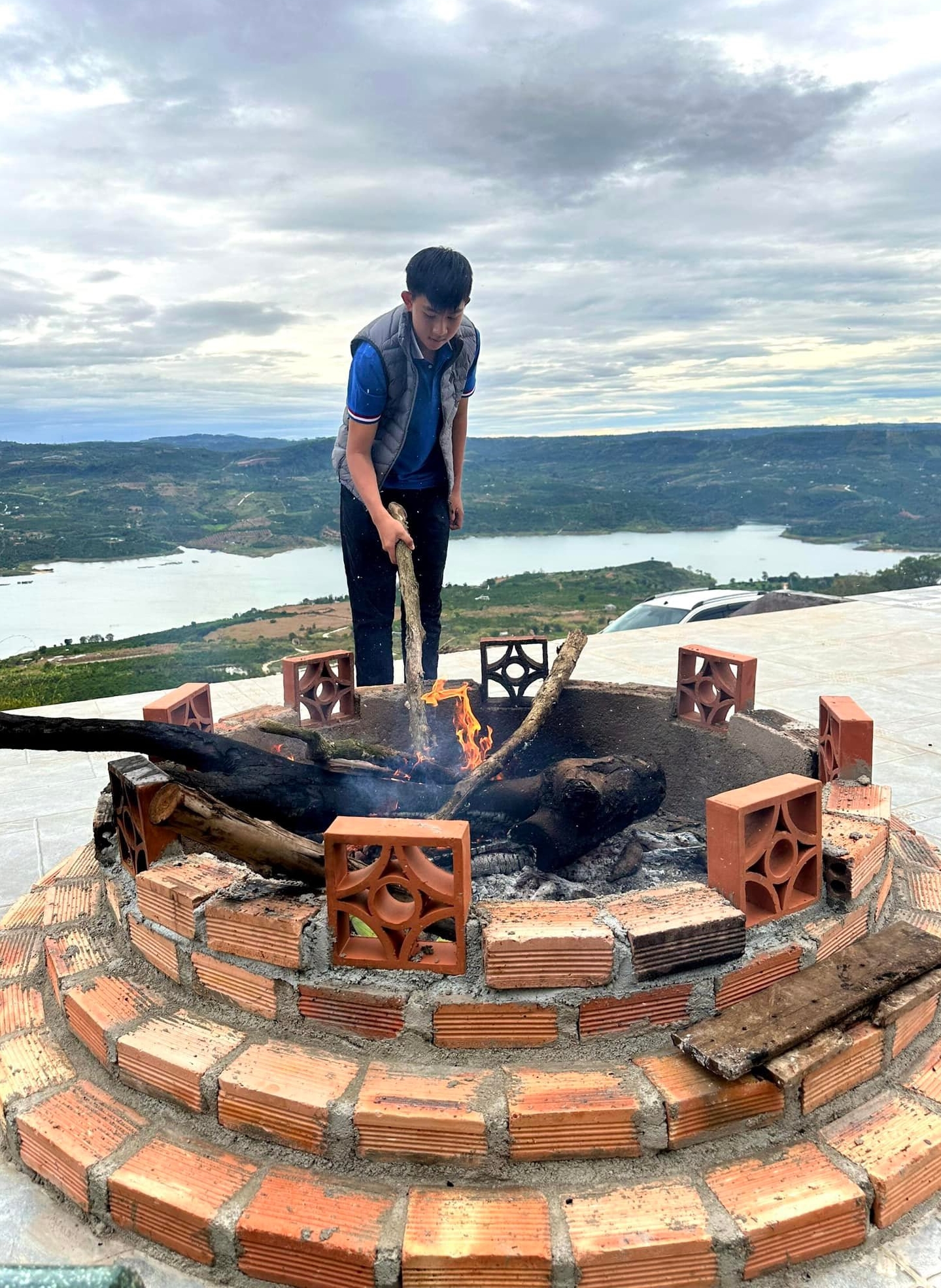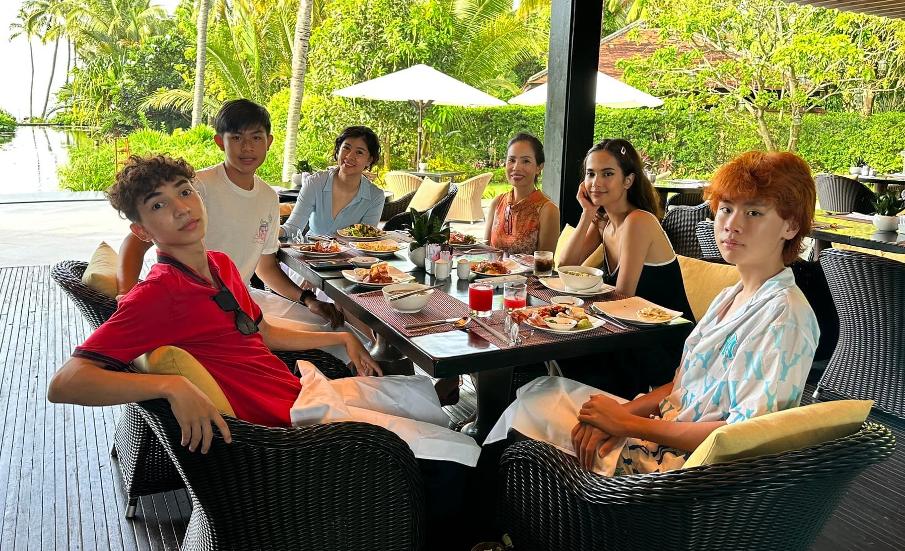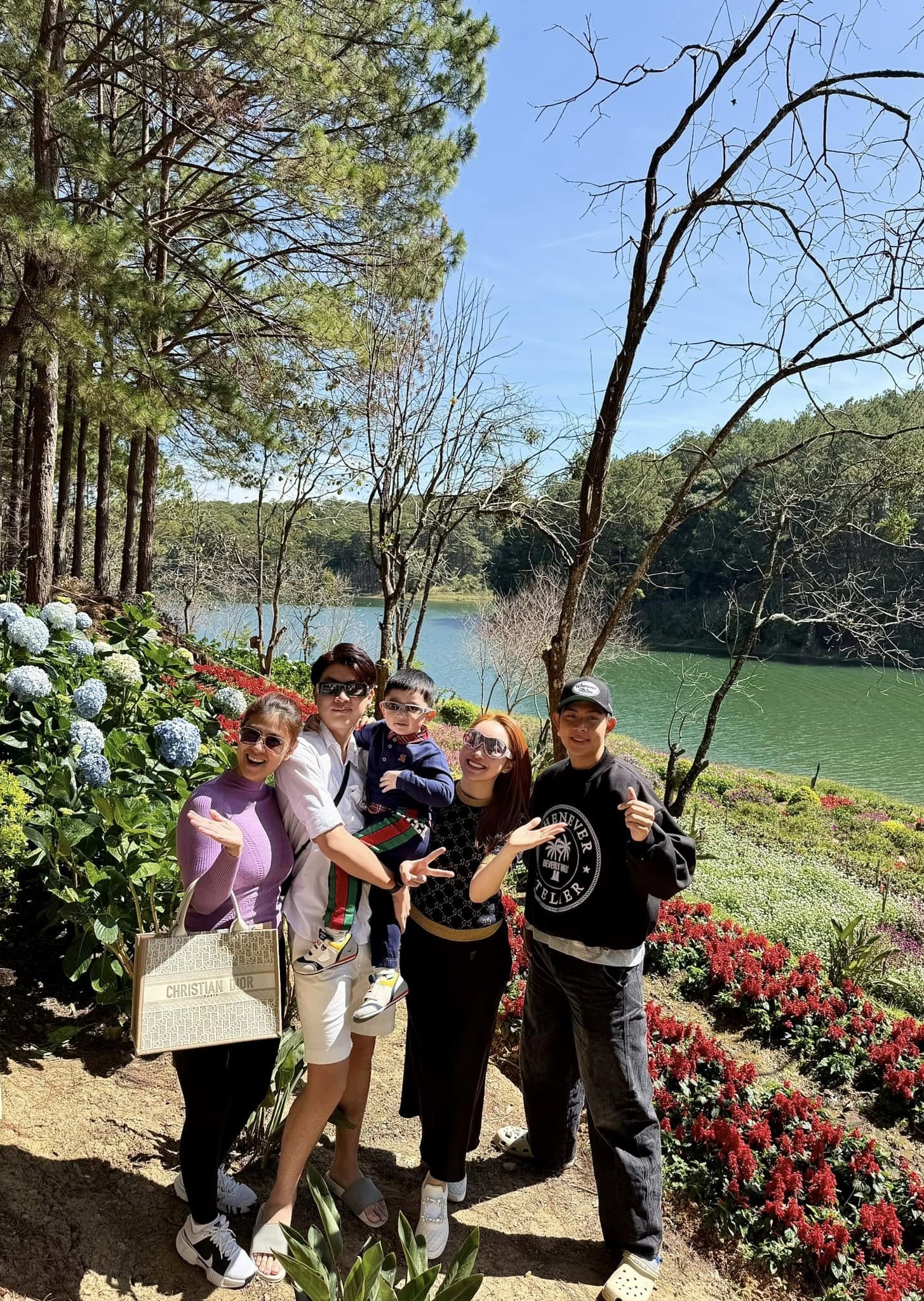 Kim Thu and her two sons pose for a photo during a trip to Da Lat earlier this year, accompanied by actor Chi Bao's wife (second from the right).