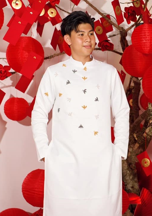 He looks like a young man in traditional ao dai attire, taken at the beginning of the year.