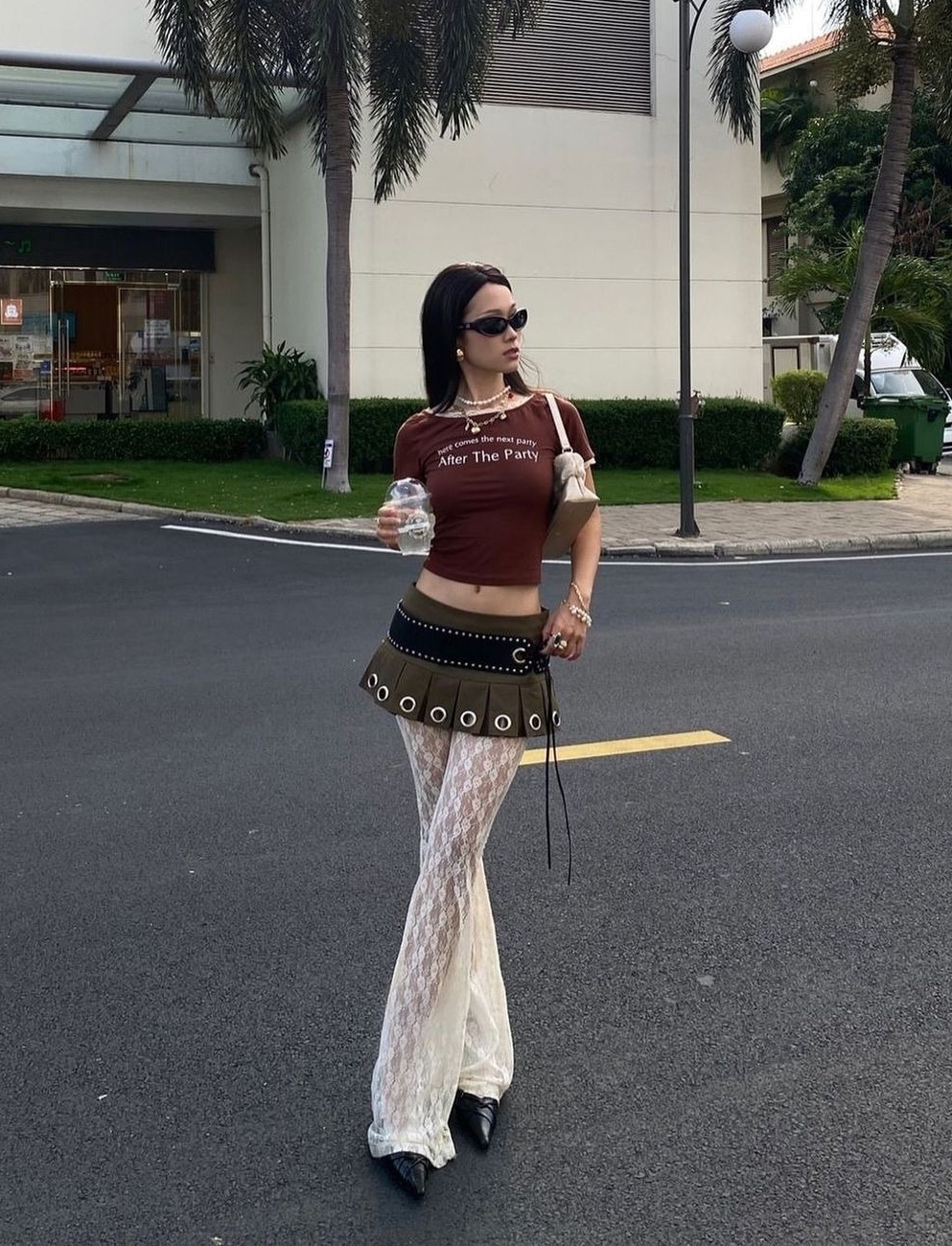 The Y2K style is showcased with white lace pants, a micro-mini skirt, and a camisole. Photo: Pinterest