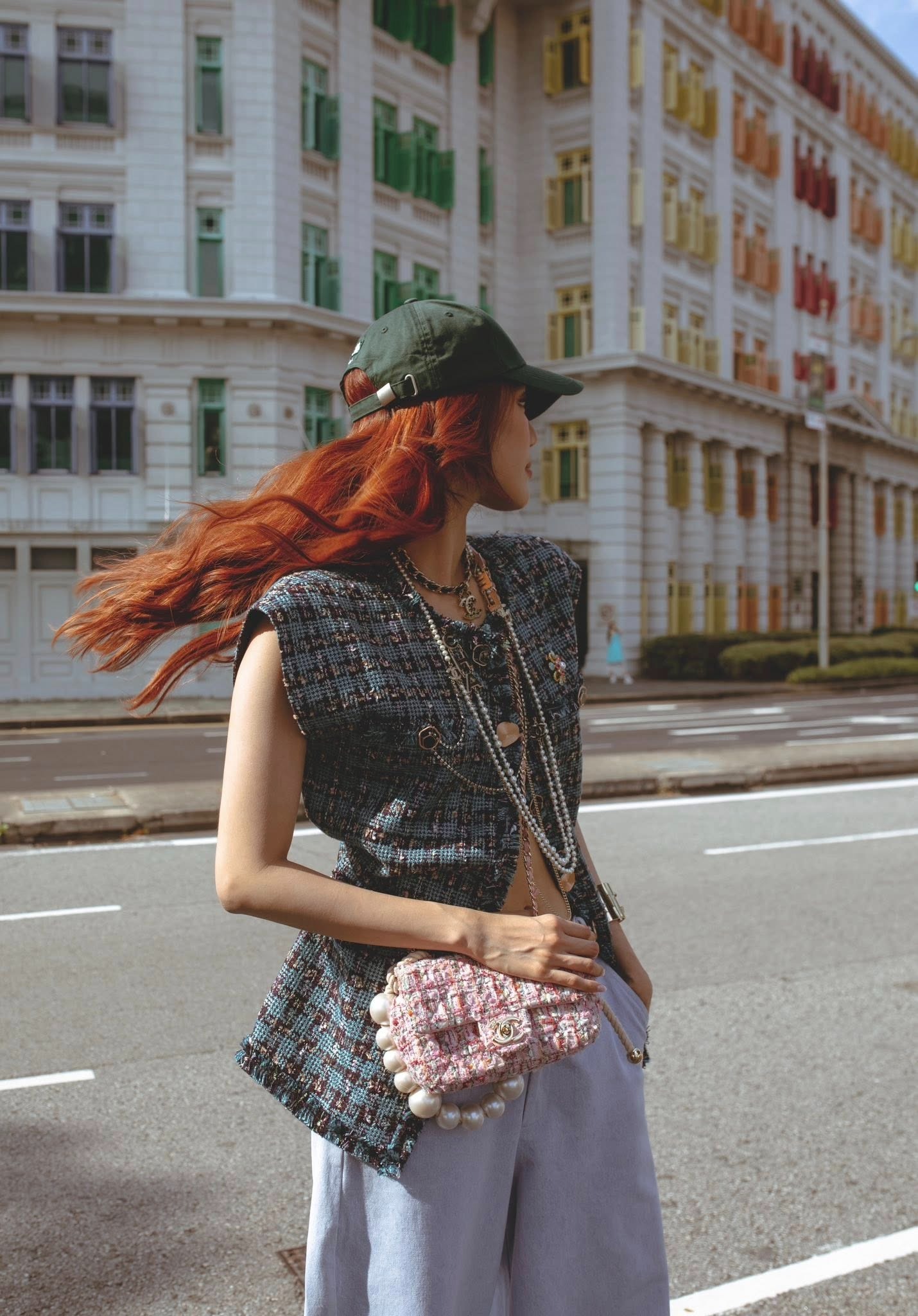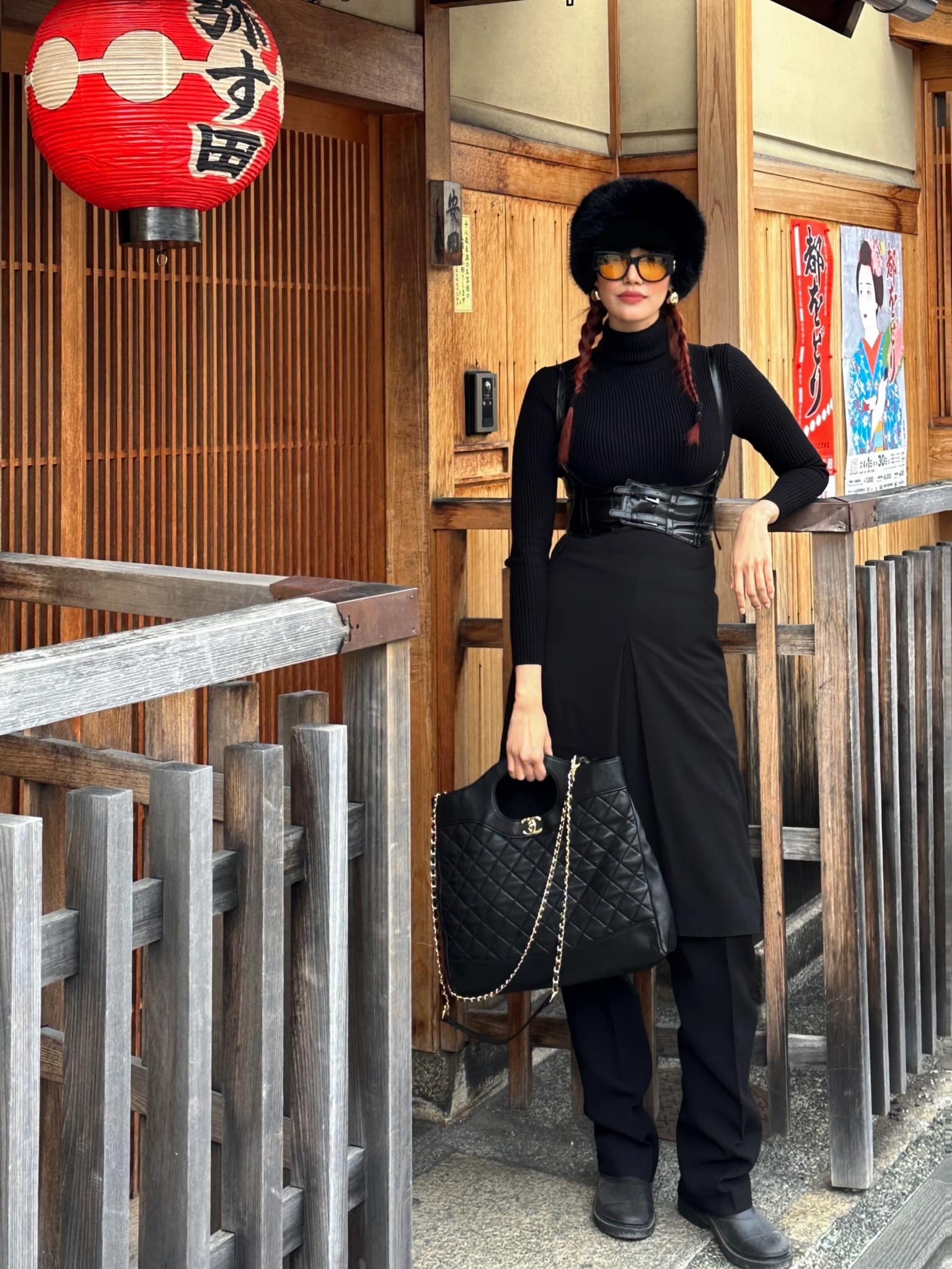 Lan Khue's travel style features a dress-over-pants look and a classic quilted bag. |