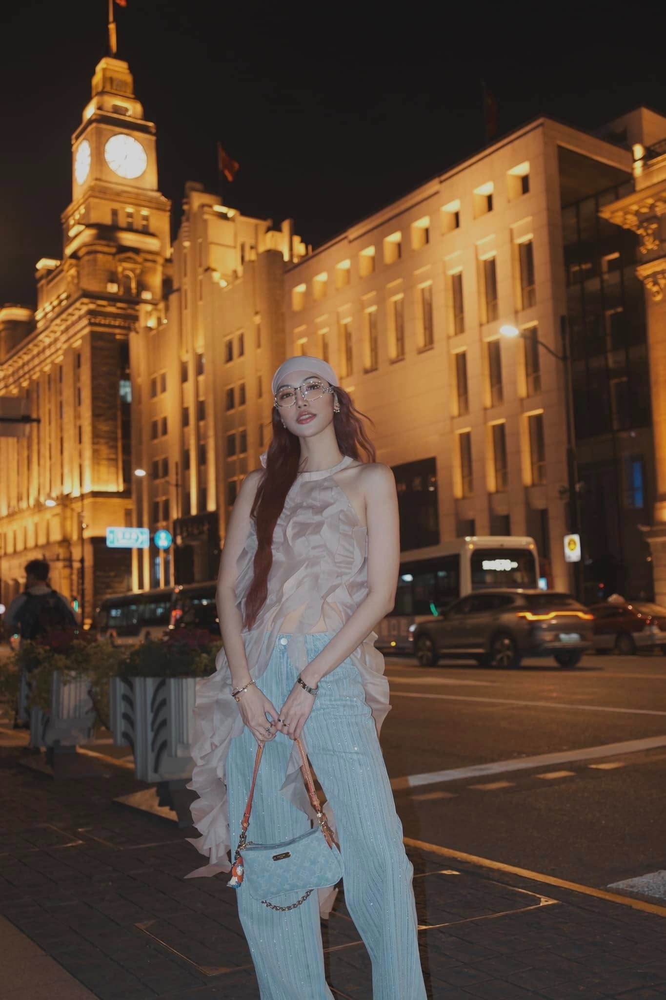 Recently, embracing the Y2K and 1990s trends, Lan Khue has been seen sporting dresses with pants. On one outing, she paired Loewe jeans with a Louis Vuitton Side Trunk MM bag priced at USD 3,900 (nearly 103 million dong). |