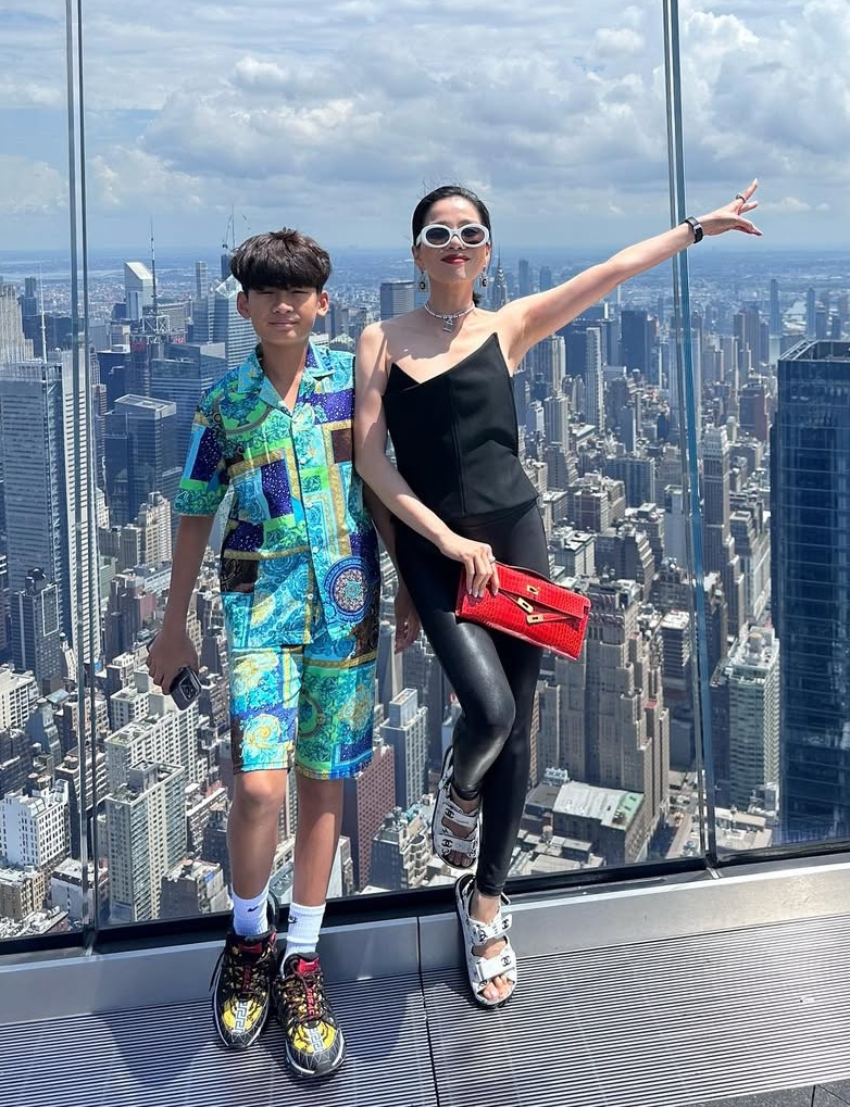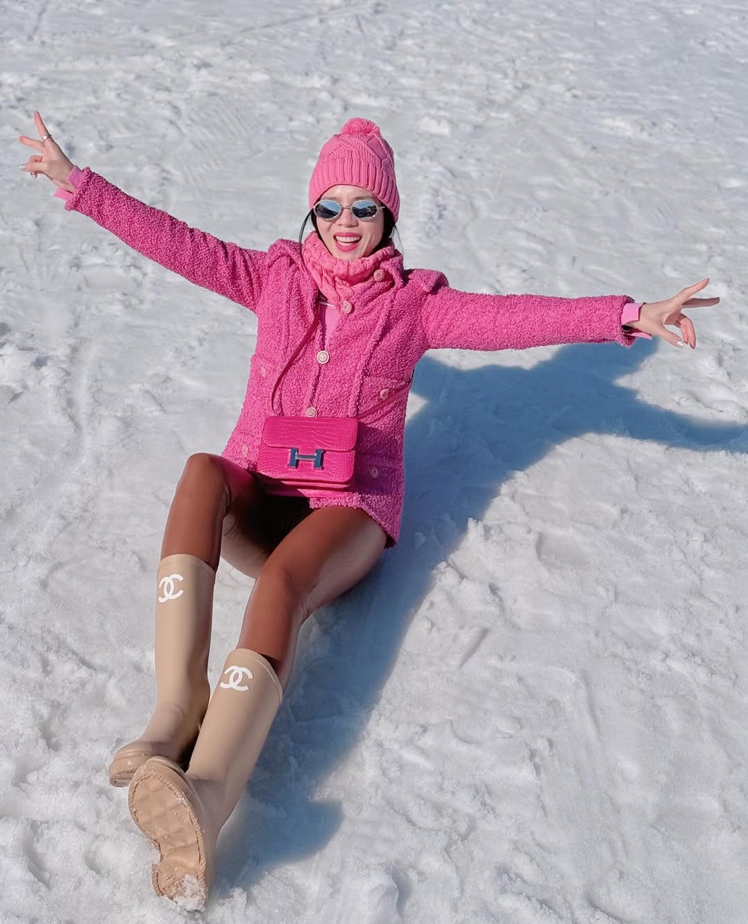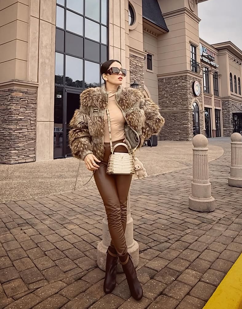 Le Quyen often pairs these figure-hugging pants with matching leather crop tops. She enhances her fashionable look with luxury accessories, including a Hermes crocodile Birkin bag, a Chanel jacket, glasses, and boots.