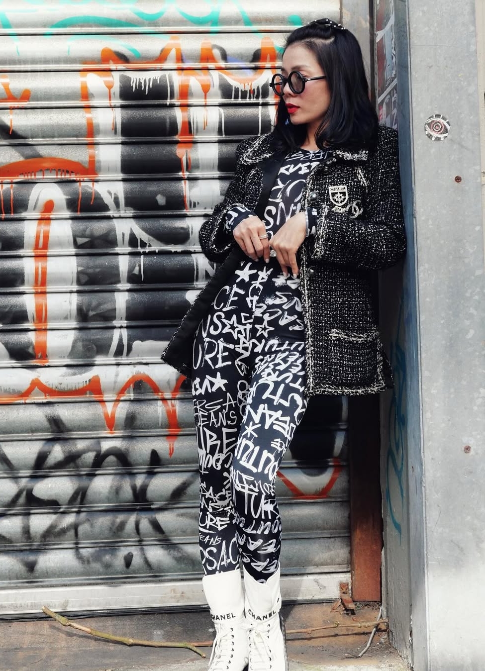 Le Quyen explains her preference for leggings, citing their convenience and effectiveness in accentuating her curves. She particularly appreciates their high waist, which creates the illusion of longer and slimmer legs. Her collection also includes numerous heavily patterned designs in a maximalist style, often worn with matching tight tops.