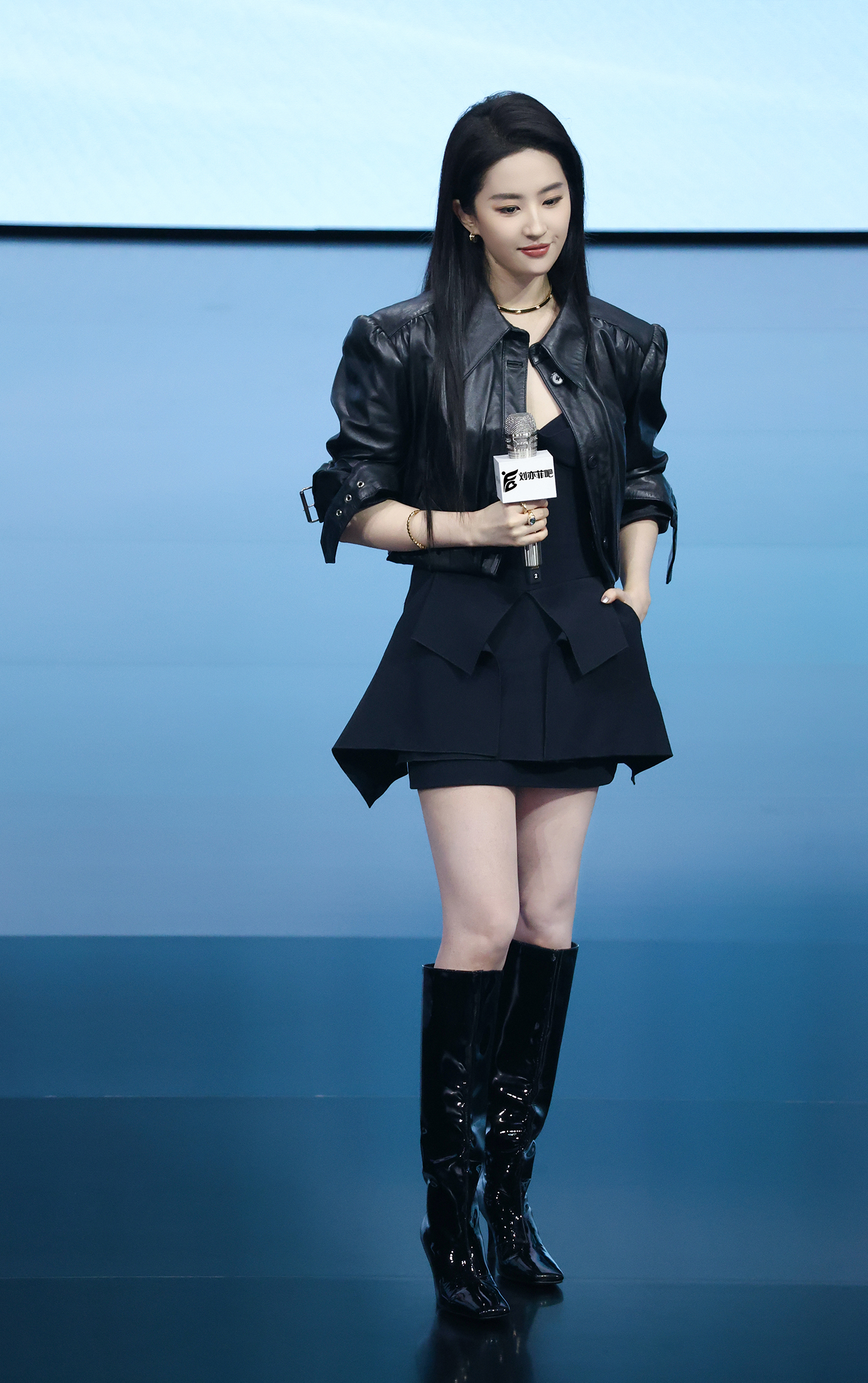 She sported a youthful, modern look with a short dress, jacket, and high boots.