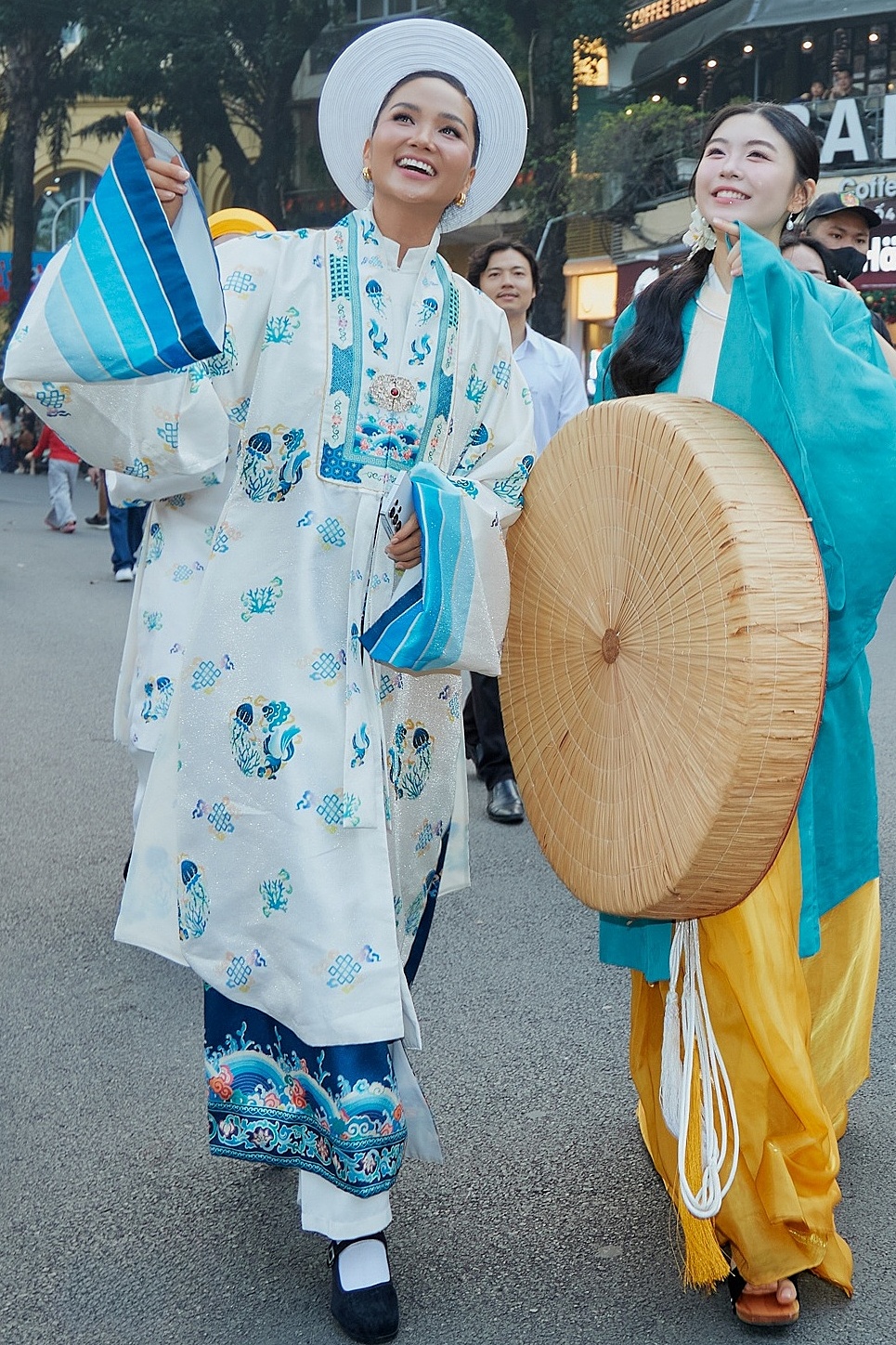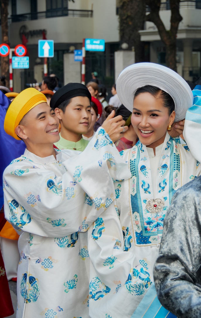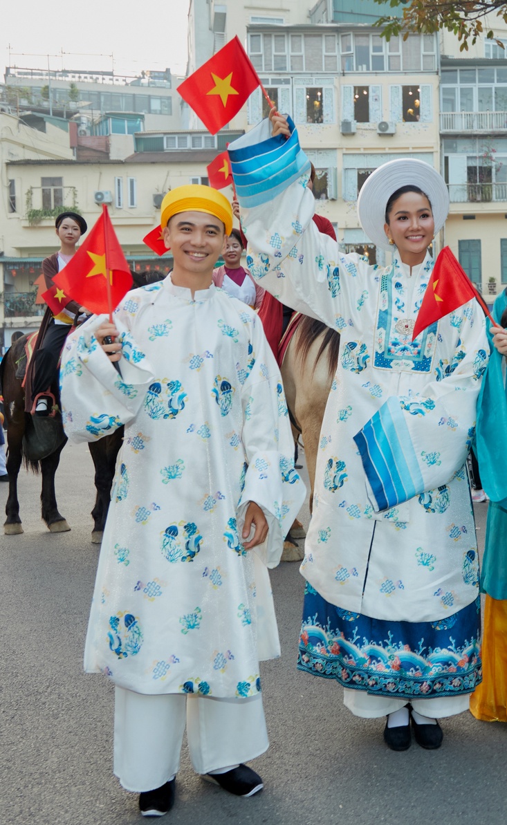 Lo Lem (right), along with Miss H'Hen Nie and her husband, participated in Bach Hoa Bo Hanh, an event within the Vietnam Happiness Festival 2025. The Ministry of Culture, Sports and Tourism organized the event on 7/12, drawing participants to the streets around Ho Guom.