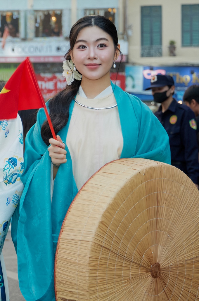 Lo Lem chose a multi-layered, softly colored outfit for the event. She carried a wide-brimmed hat, adorned her hair with flowers, and accessorized with pearl earrings and a silver necklace. Her real name is Mai Thao Linh, 19 years old, the eldest daughter of actor Quyen Linh and businesswoman Da Thao. She is currently a university student in TP HCM. Lo Lem is praised for her English proficiency and has been independent from an early age through work as a photo model and brand ambassador. Earlier this year, she garnered attention for purchasing a car valued at 9 billion dong.