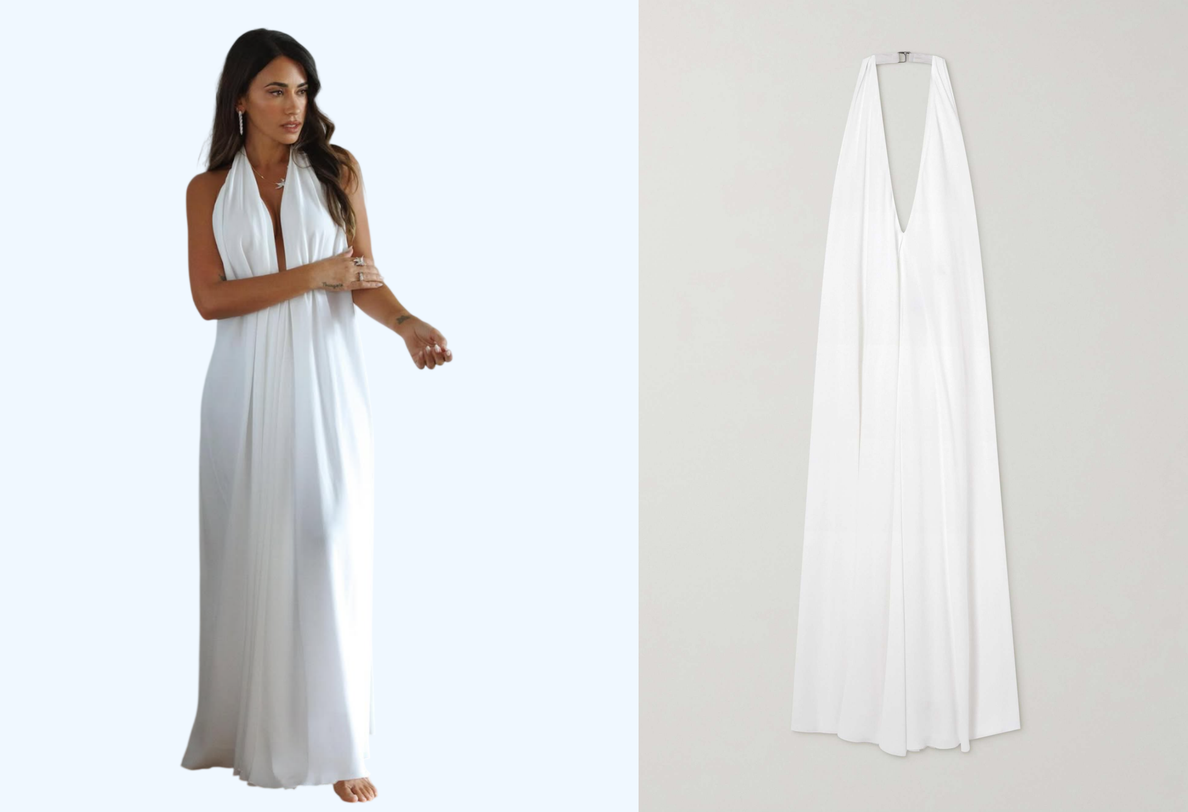 She also acquired a similar deep-cut dress in a different color to vary her everyday style. The design, featuring a sheer, floor-length hem, creates the illusion of longer legs.