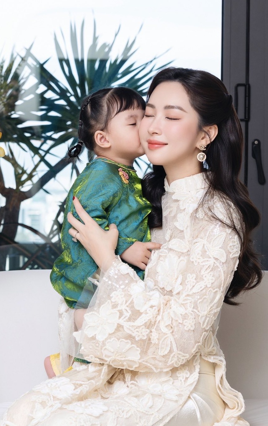 During the New Year, the beauty queen was photographed with her husband, businessman Trung Tin, at their family villa, wearing an ao dai adorned with embroidered flowers. Her hair was styled in a half-updo with softly curled ends, enhancing her graceful demeanor. She accessorized with Gucci earrings while posing alongside her youngest daughter, who is nearly two years old.