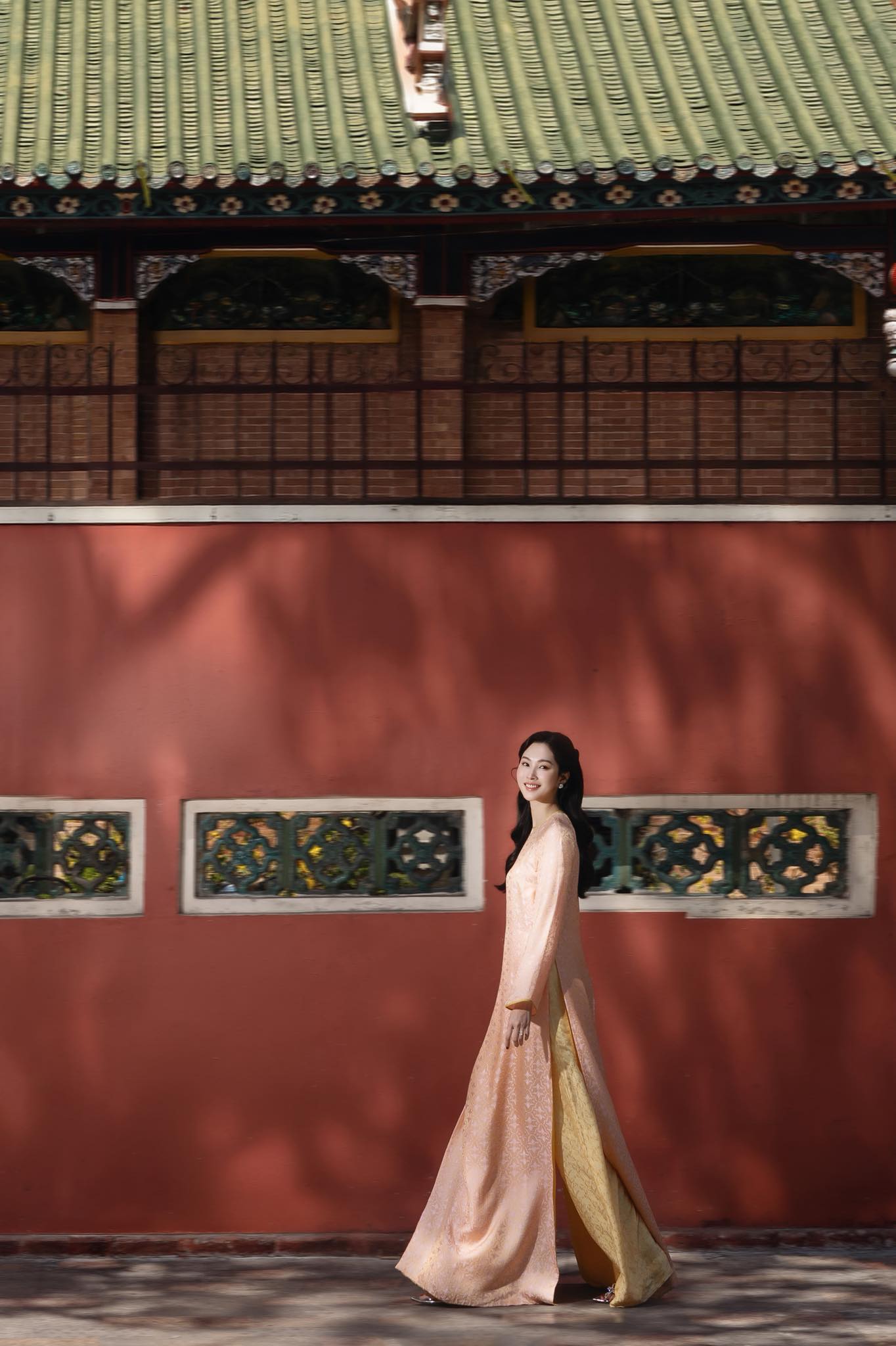 For a special spring photoshoot, Thao donned an ao dai in delicate pastel shades, crafted from luxurious silk. The fabric featured subtle, embossed patterns with a gentle sheen, perfectly complementing her signature understated elegance. She completed her look with natural makeup and a simple, elegant hairstyle.