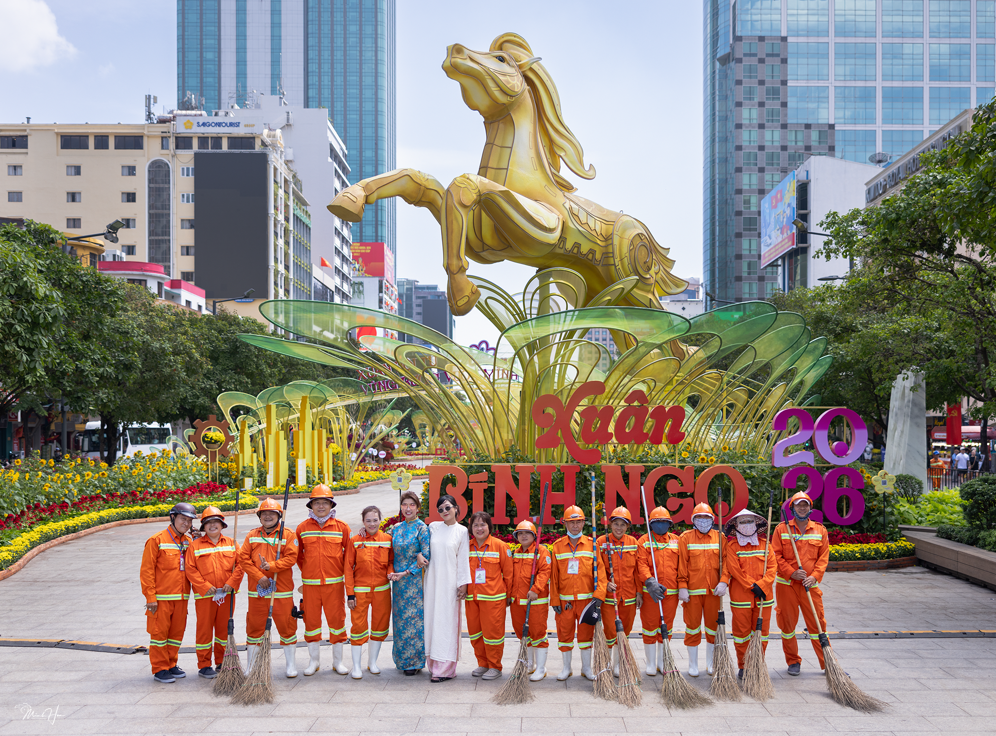 Both took a commemorative photo with the sanitation workers of Nguyen Hue flower street. The beauty queen said she liked this photo the most because she always appreciates those who work to keep the streets clean. |