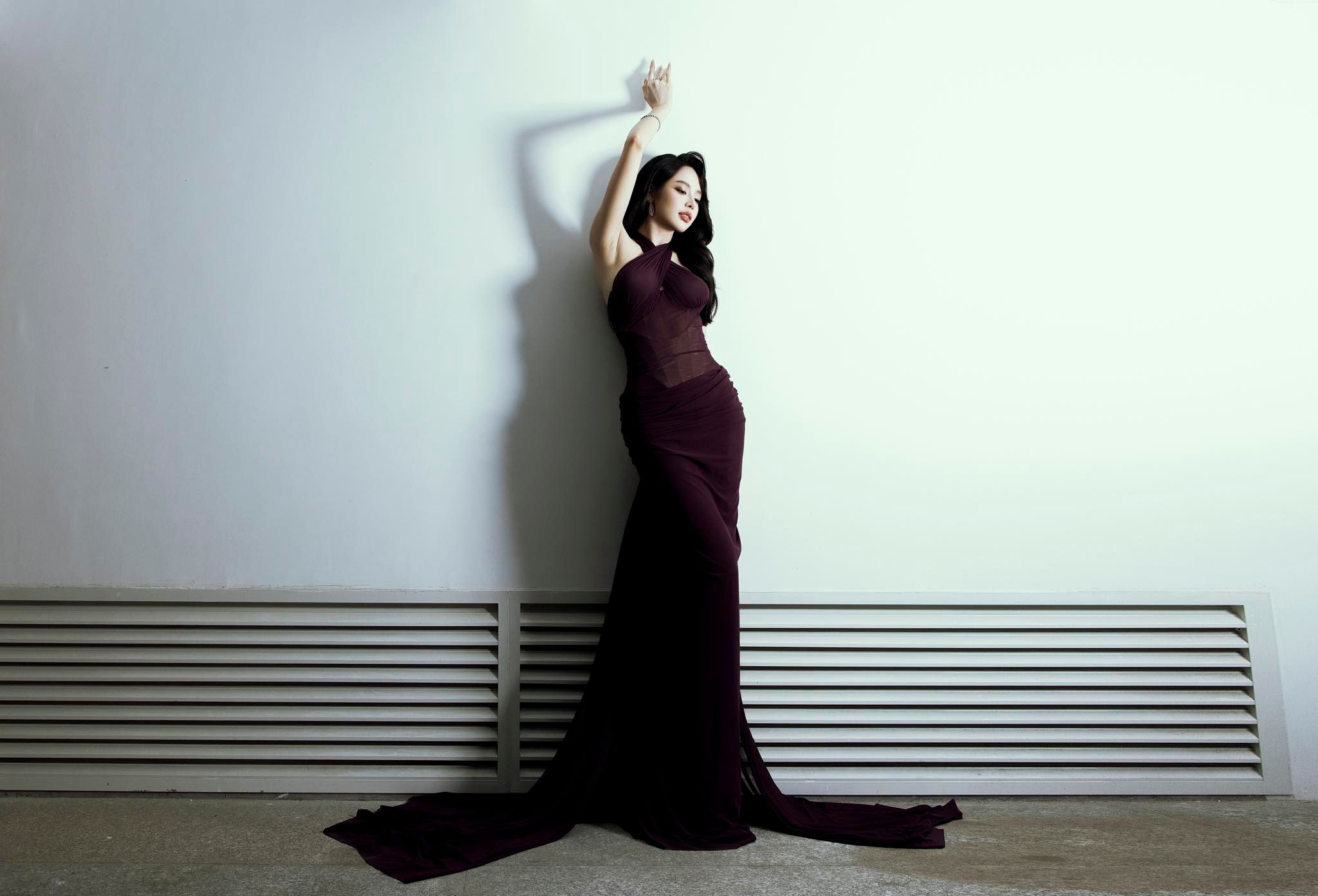 As a guest presenting an award for one category at the Lan Song Xanh event on the evening of 30/1 in Ho Chi Minh City, Thanh Thuy wore a dress by designer Do Long. The garment, in a deep purple hue, featured high-quality stretch fabric with elasticity and drape, crafted using a draping technique to create movement along the body of the dress. A key detail was the waist section, which incorporated a visible boning corset structure beneath a sheer fabric layer.