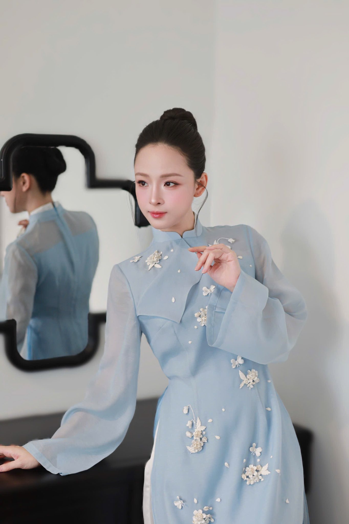 Ao dai featuring bird and floral patterns helped Phuong Nga stand out during a filming session.