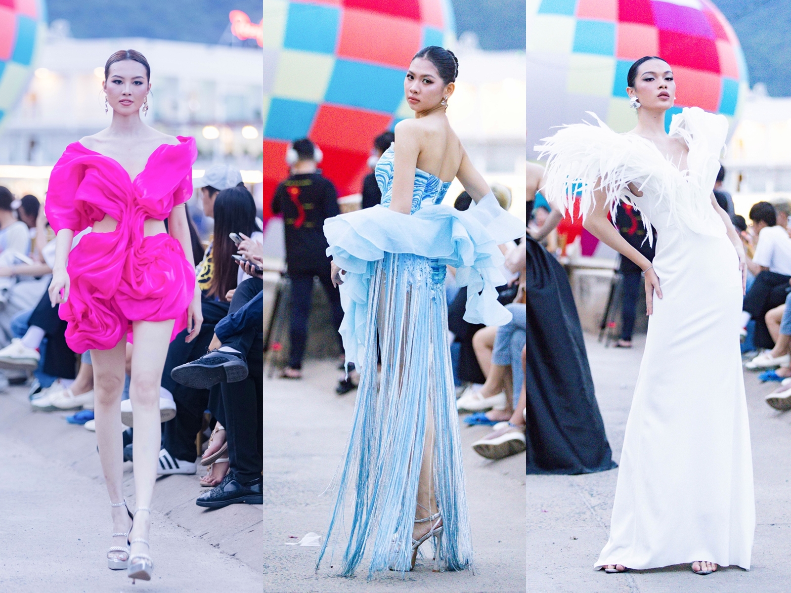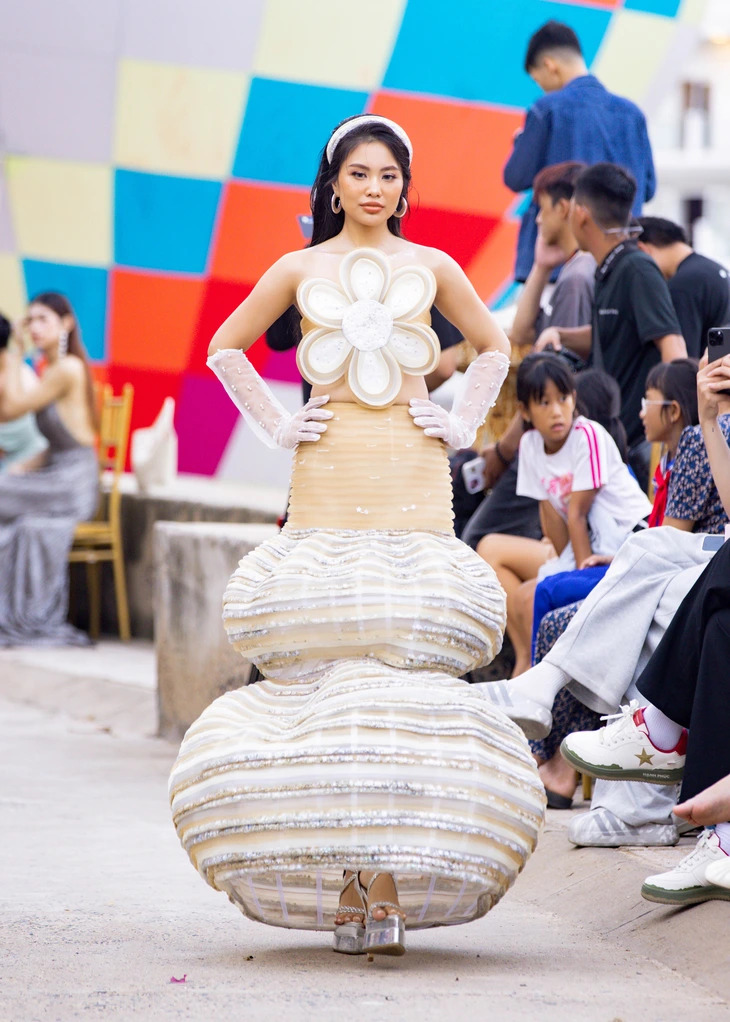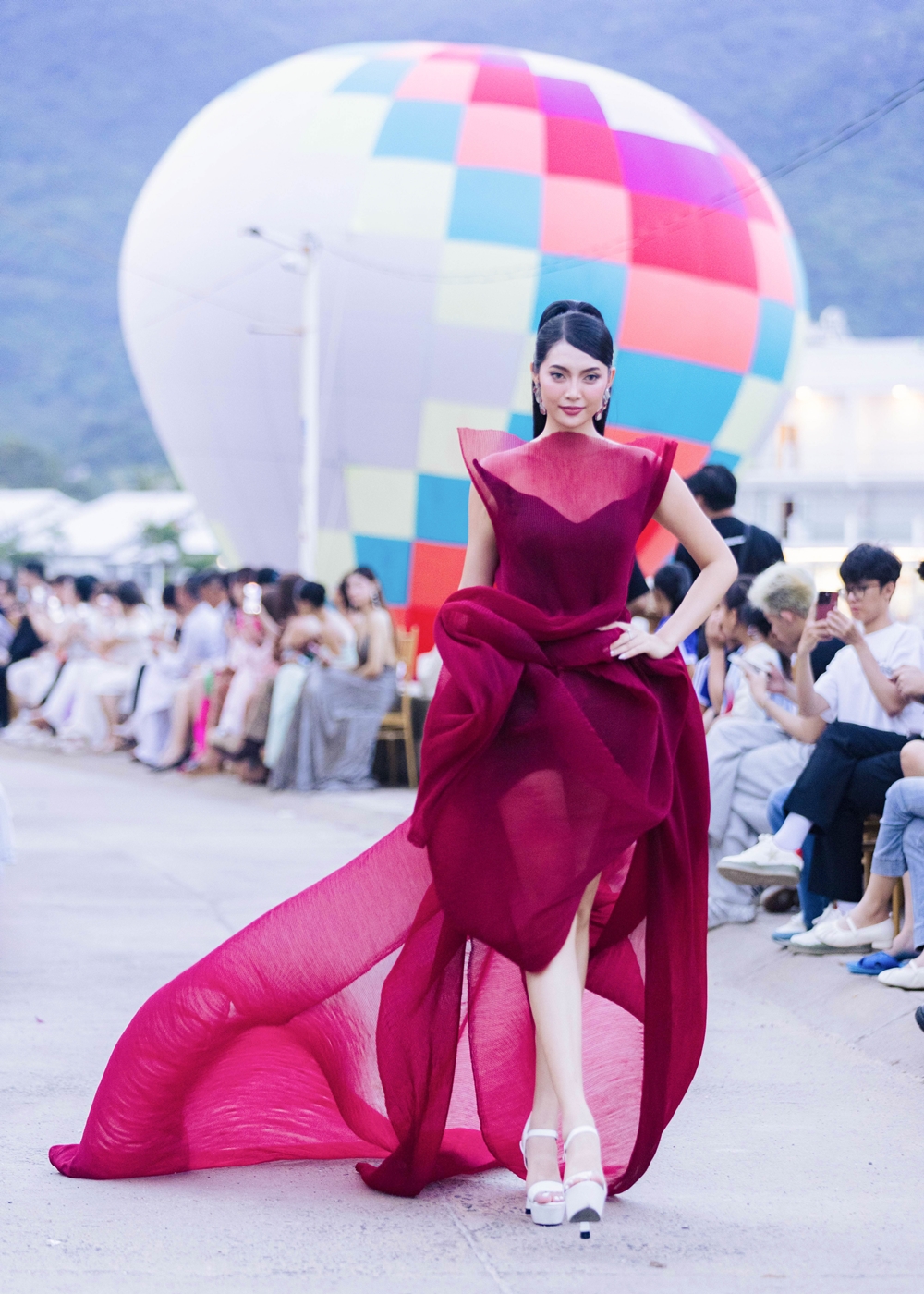 Hoang Minh Ha also mentored 11 young designers, helping them present their collections on a professional runway. Thuy Uyen wore a tiered design by Pham Khanh Quynh. |