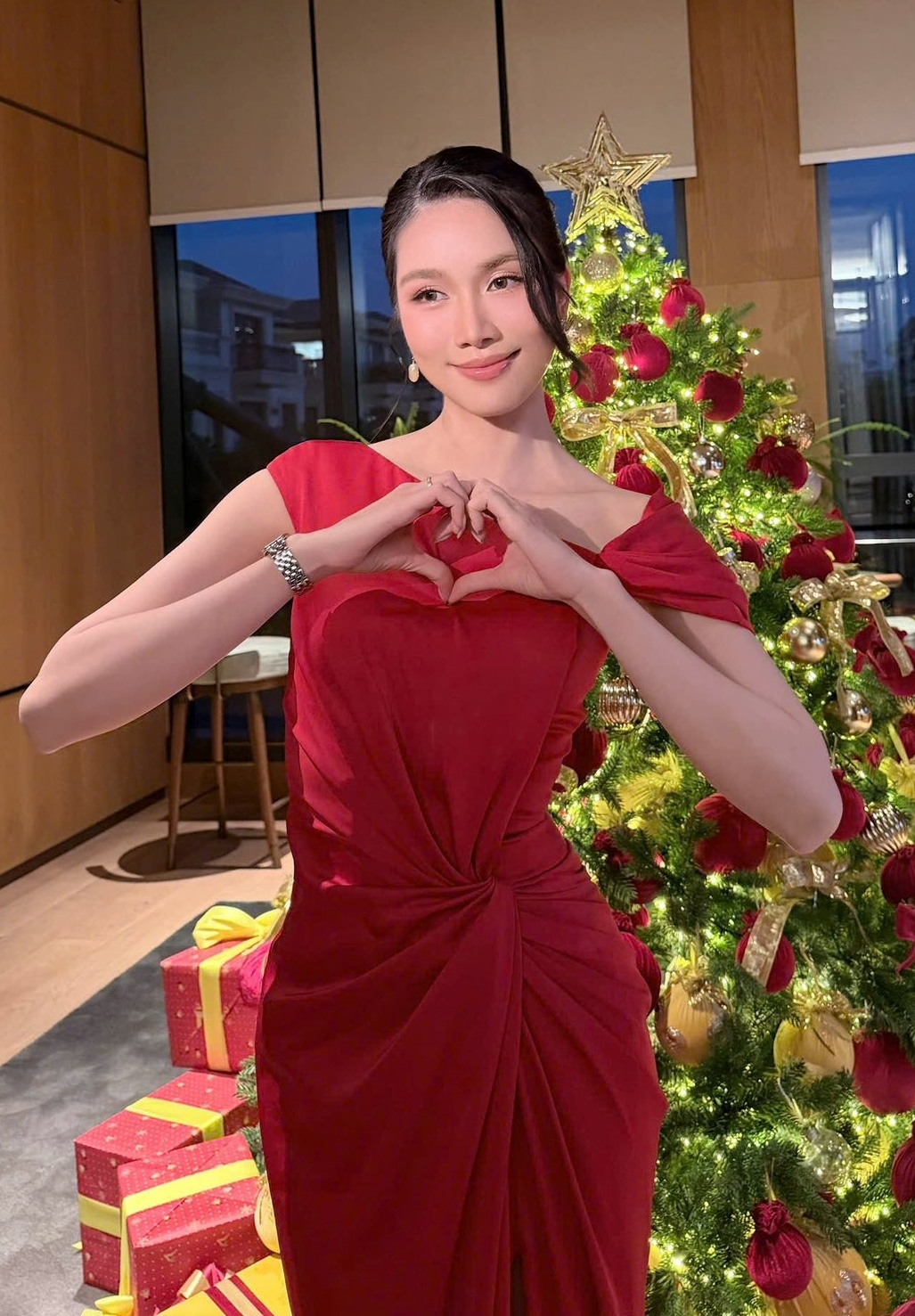 Do Thi Ha wore an off-shoulder, deep red dress for a photoshoot at her home. She and her husband decorated their space with a Christmas tree, adorned with bows, fairy lights, and teddy bears. This marks the beauty queen's first Christmas with her husband since their wedding in October.