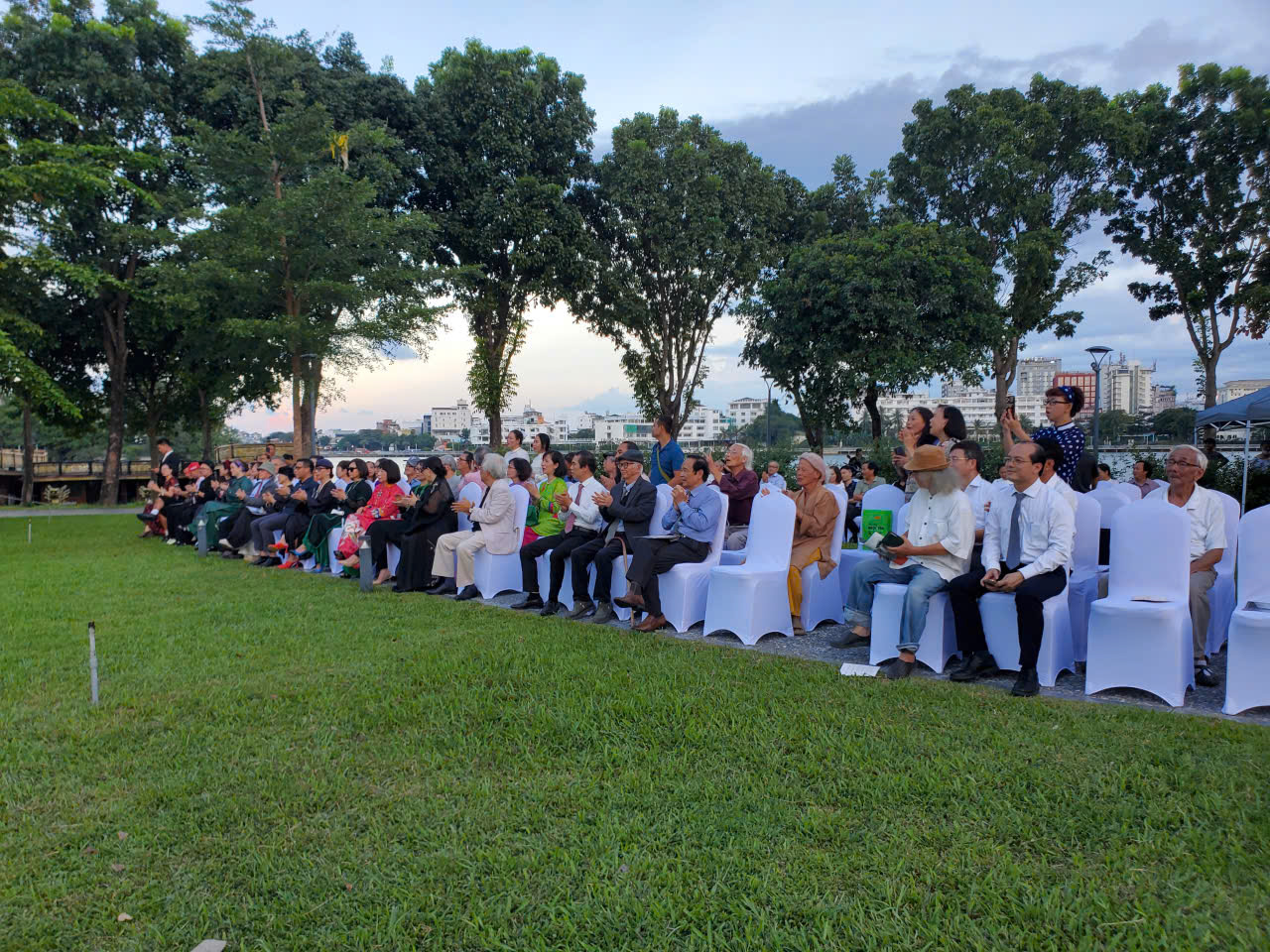 Following the monument's unveiling, the melodies of Trinh Cong Son's music filled the air, performed by saxophonist Tran Manh Tuan and vocalists Duc Tuan, Tan Son, and Ha Le. Family, friends, and the audience joined in singing "Noi Vong Tay Lon" in front of the statue of the late musician embracing his guitar in the park.