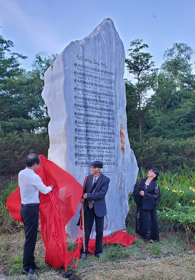 The monolithic stone monument, over 5 meters tall, stands beside the statue of the musician. Singer Trinh Vinh Trinh, Trinh Cong Son's younger sister, and her husband, along with other siblings, were present at the ceremony. Many family members traveled from abroad to attend. Writer Buu Y, a longtime friend of the late musician from Hue, and a large crowd of Trinh Cong Son's fans also attended the ceremony.