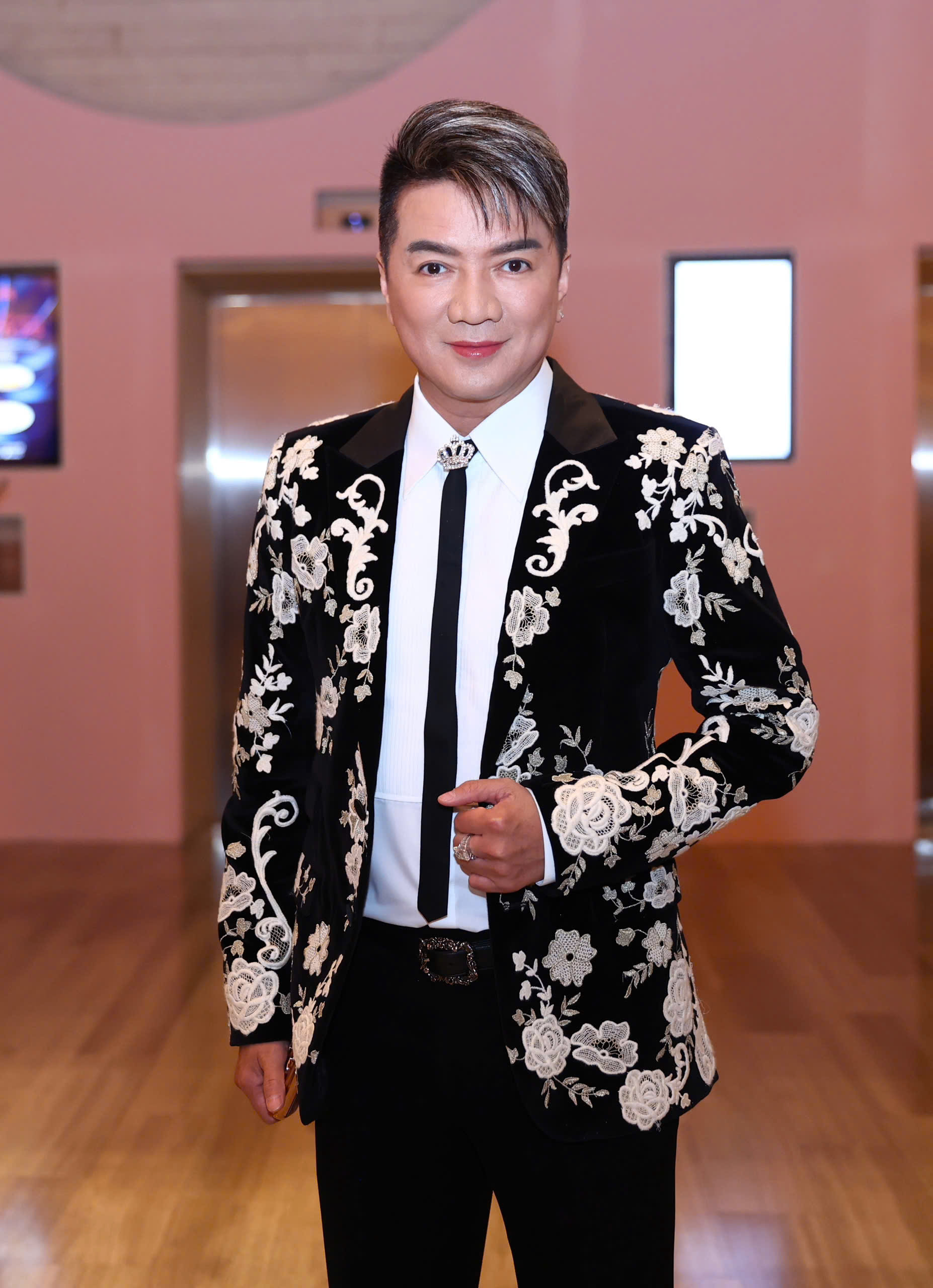 Singer Dam Vinh Hung wore a floral-patterned suit by Dolce & Gabbana.