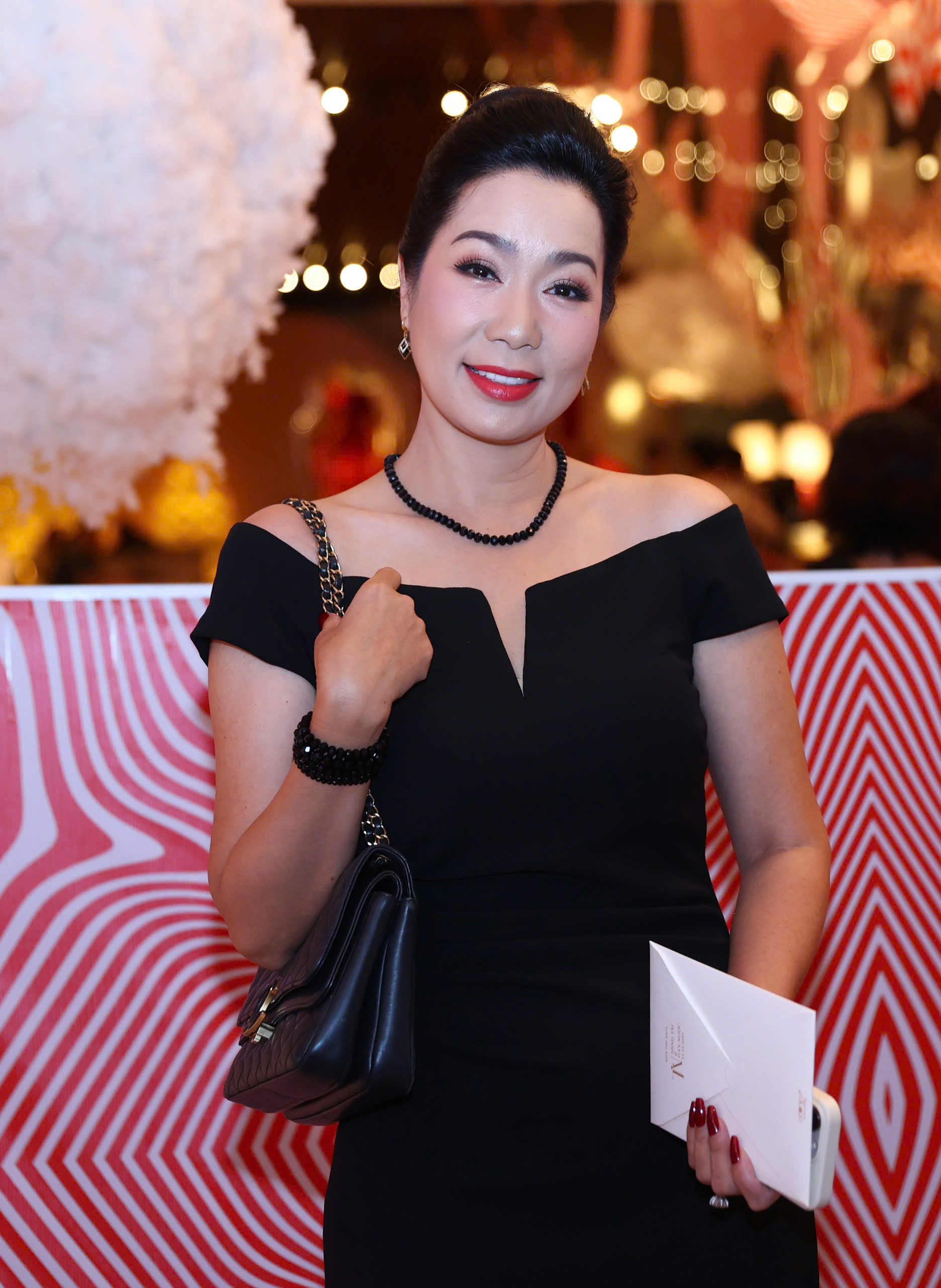 Actress Nhat Kim Anh paired an off-the-shoulder dress with a Chanel handbag. She previously co-starred with Doan Minh Tai in the 2016 television series "Song Gio Gia Dinh".