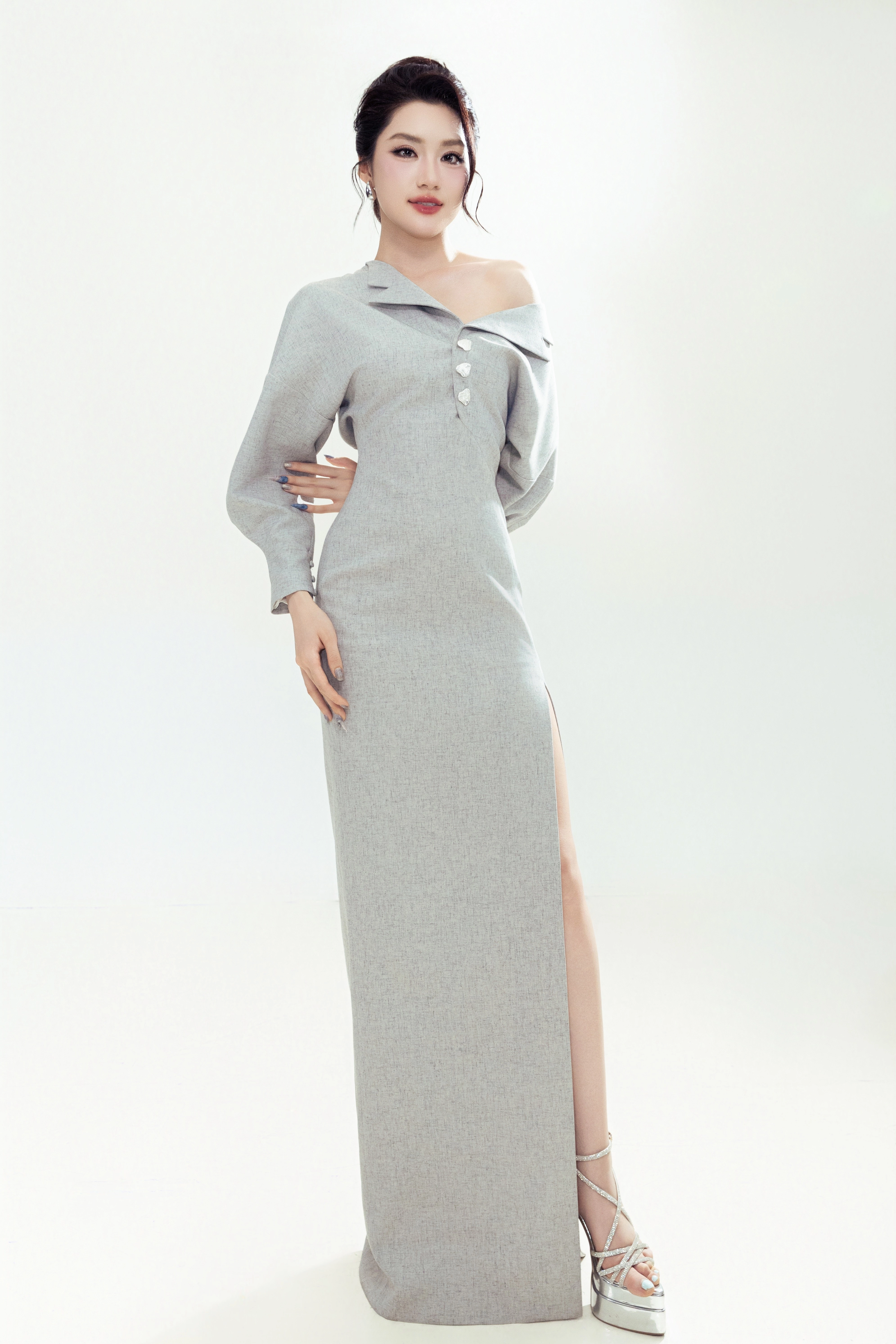 The miss wore a high-slit dress, highlighting her slender legs.