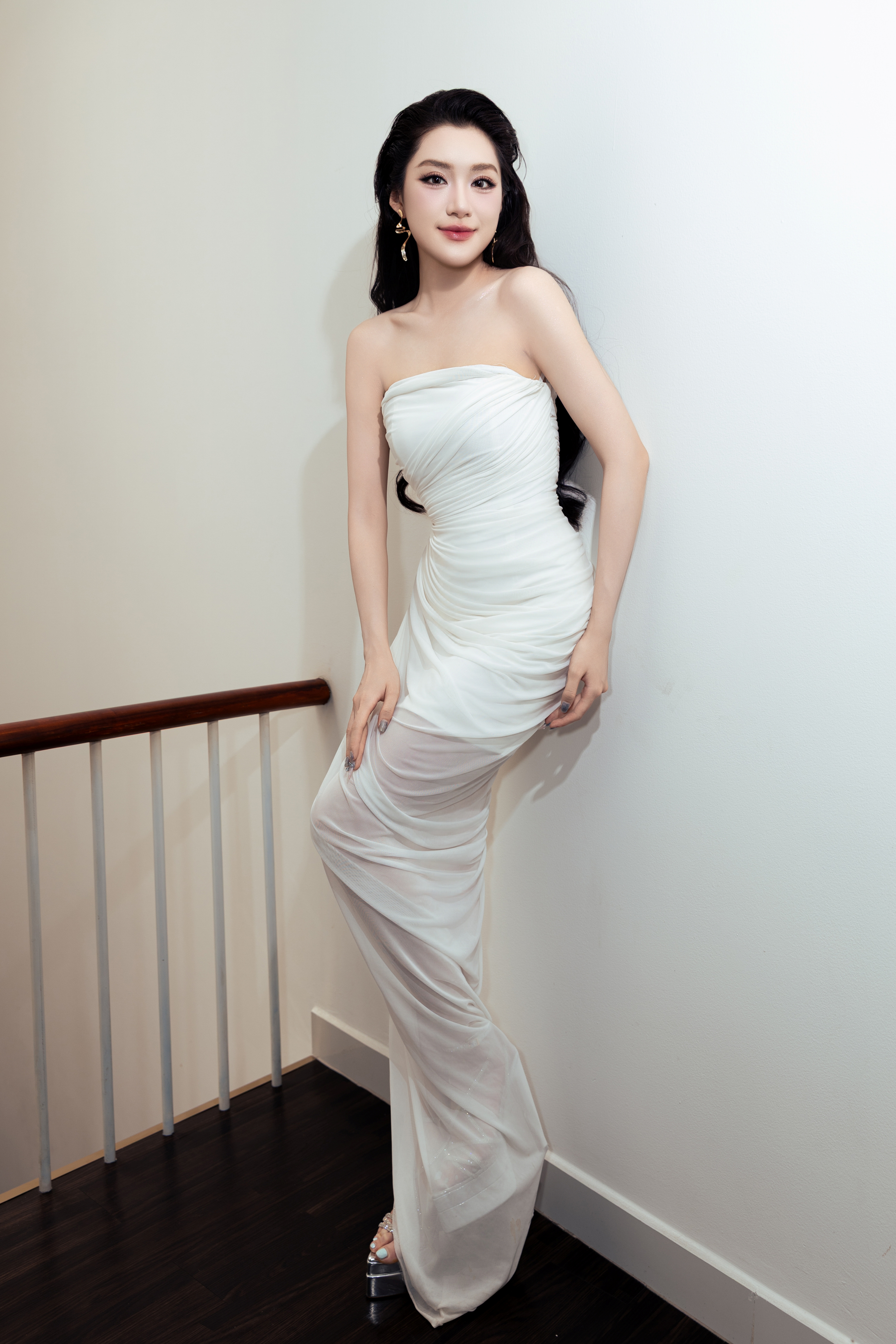 A sweetheart neckline dress, highlighting her bare shoulders, was Phan Phuong Oanh's choice at an event on 1/4. She minimalized accessories, using only medium-sized earrings for emphasis.