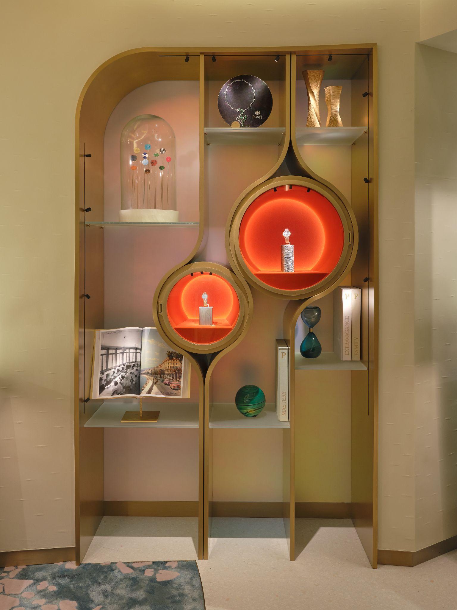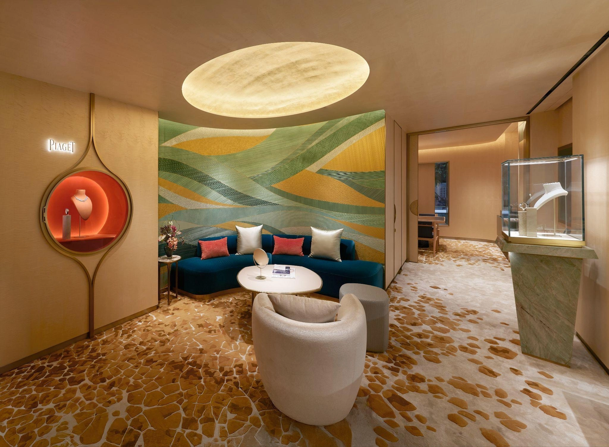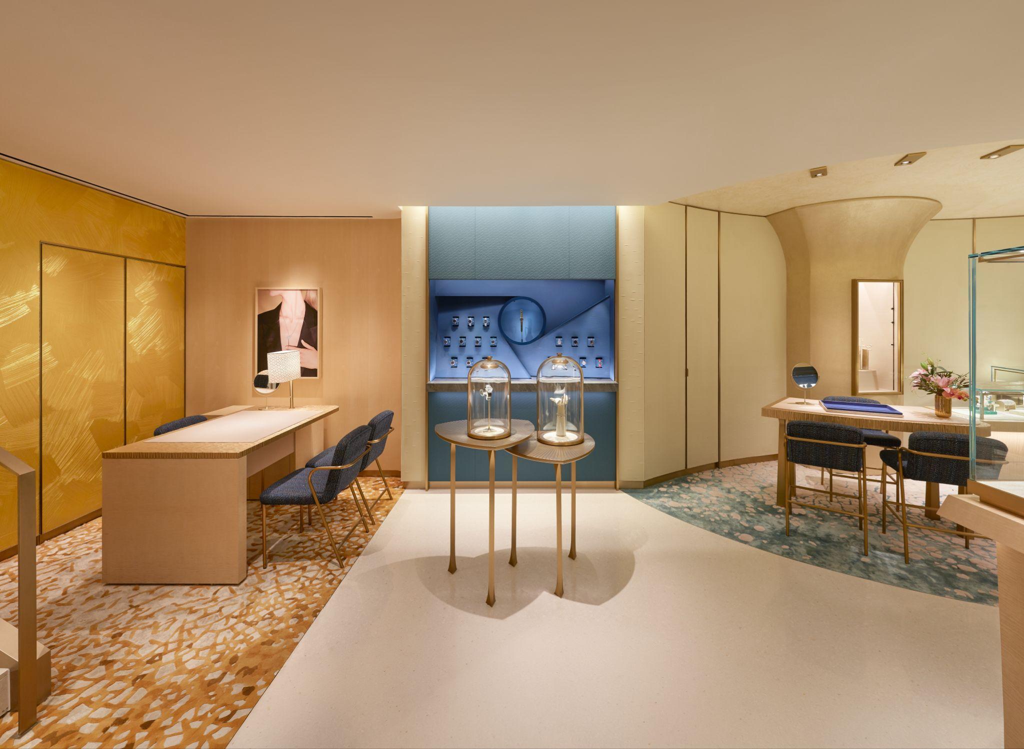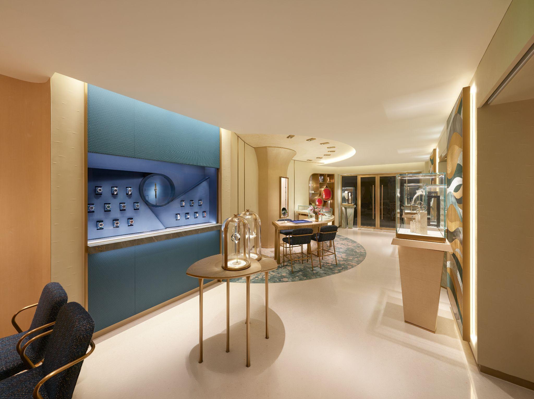 The interior space utilizes high-end, elegant, and inviting materials. The brand incorporates two characteristic colors associated with Piaget: gold and blue, throughout the product display areas. |