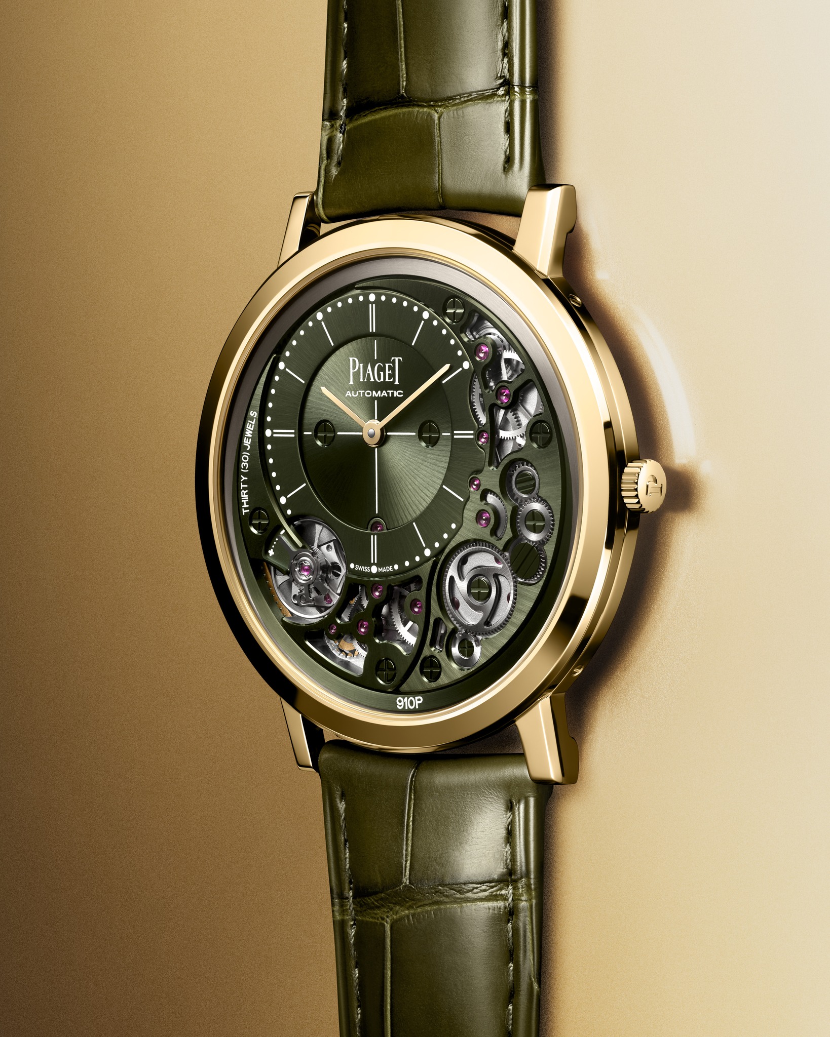 The other model, the Altiplano Ultimate Automatic, also known as the Altiplano 910P, is only 4.3 mm thick. The 910P is almost entirely enveloped in green, with a gold case chosen to accentuate the khaki hue. Artisans continuously vary the finishing, contrasting the sunburst surfaces of the 910P with the sandblasted finish of the A.U.C. Tourbillon, enhancing the aesthetic appeal of both models. Piaget's philosophy dictates that a watch should not merely be a reliable timekeeping instrument, but also a canvas for artistic expression. |