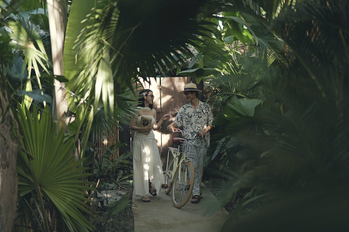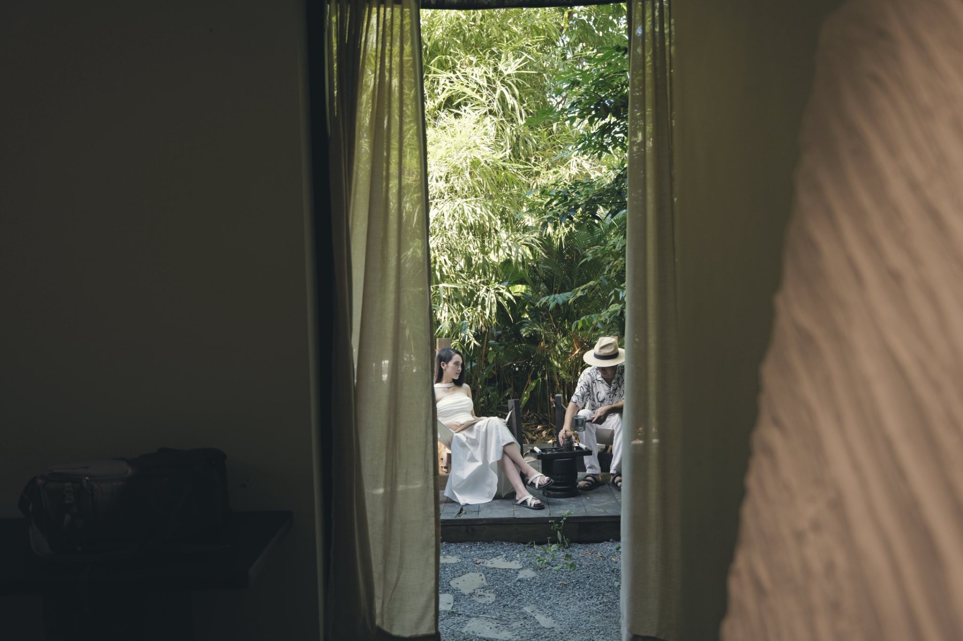 Quynh Luong's living space offers views of the large garden, furnished with warm, muted tones.