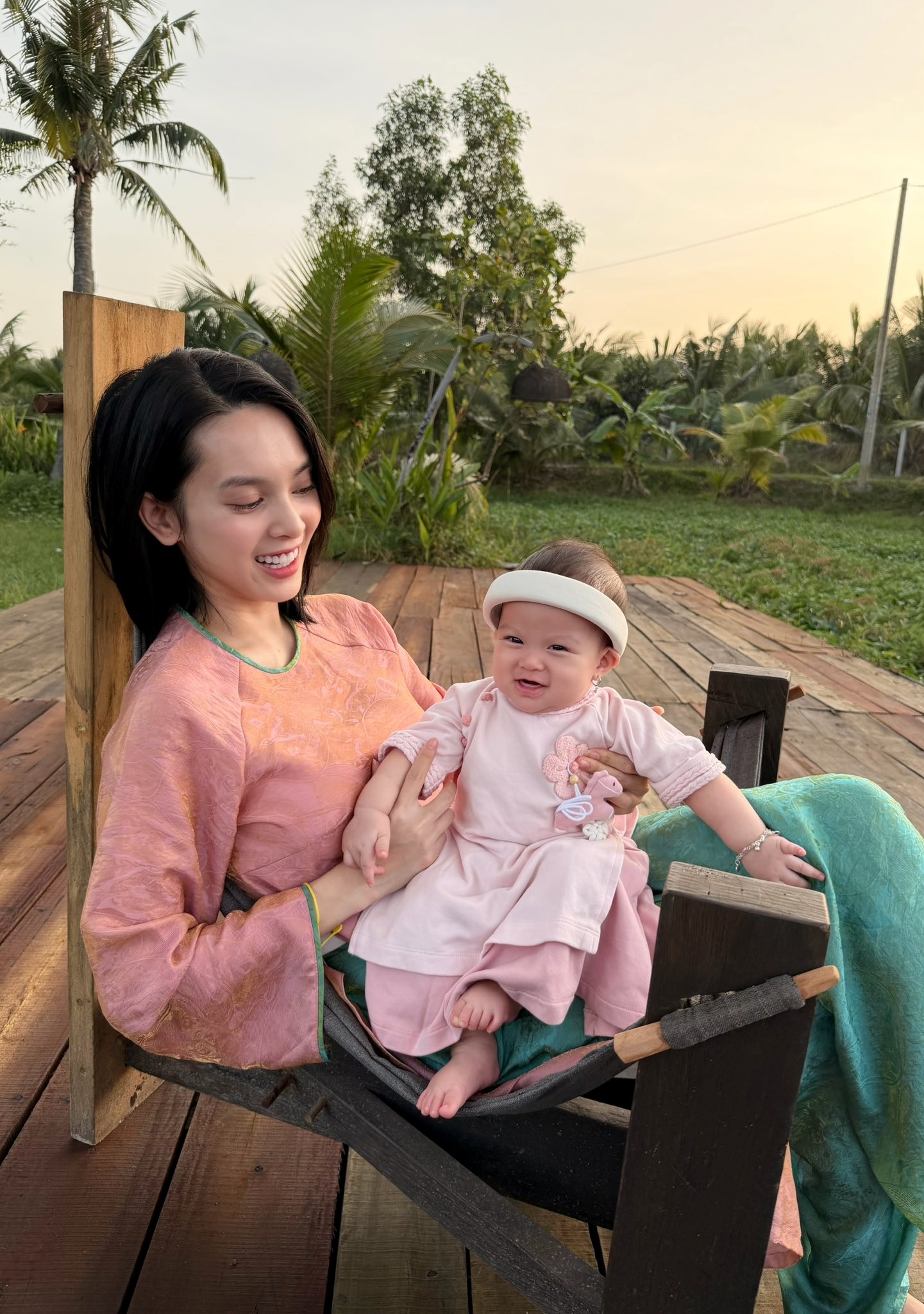 Quynh Luong's post-birth figure was captured in a photoshoot for the Binh Ngo Lunar New Year, taken at her family's garden home. She has no immediate plans to return to acting. Quynh Luong is considering suitable invitations for showbiz events. "Vinh Long to TP HCM is not too far; I can travel there and back in a day. My husband often drives me and our child along", she said.