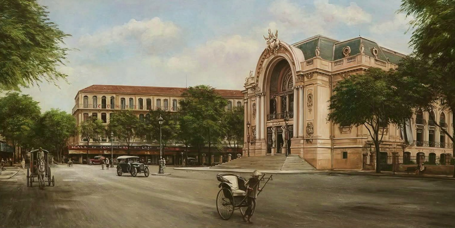The park area in front of the theater is now the intersection of Le Loi and Nguyen Hue streets. The artist mentioned that each painting takes him an average of 40 hours to complete due to his focus on intricate details.